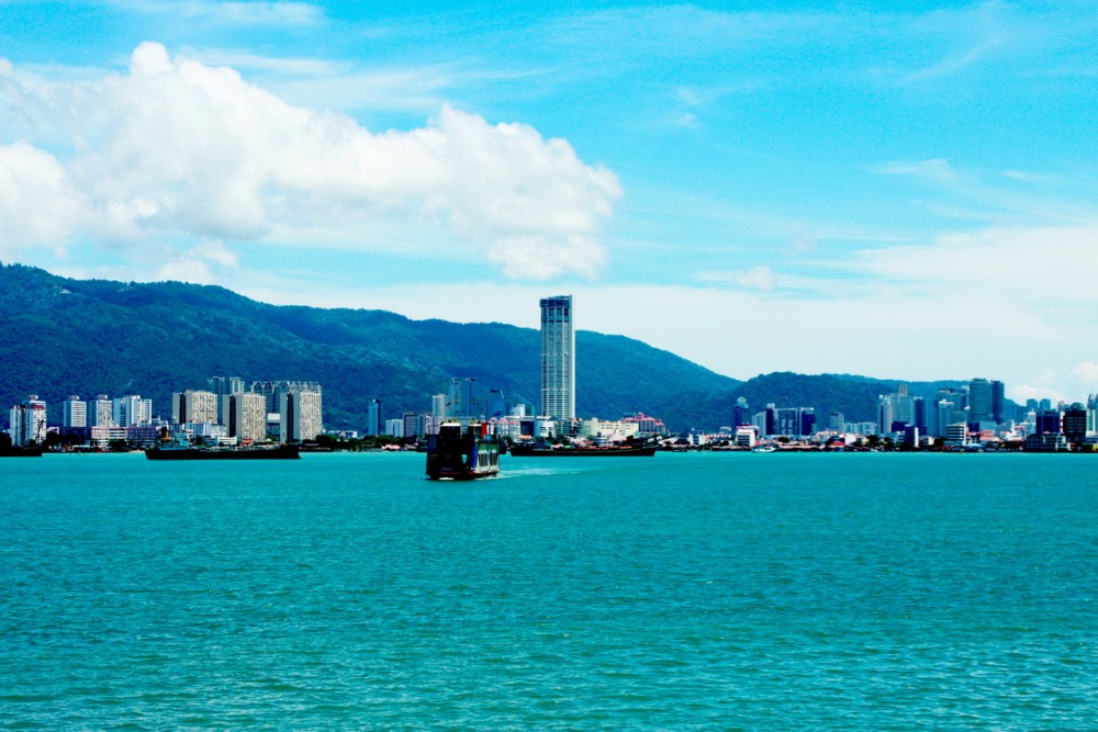 เห็นเกาะปีนังแล้ว เมฆก้อนเบิ้ม สวยเชียว ฟ้าโปร่งสดใสดมาก อย่าลืมทากันแดดนะคะ ร้อนจนไหม้เลยแดดงี้ แต่...เราไม่ทา 555555 ไม่ใช่อยากได้ผิวสีแทน แต่ครีมกันแดดอยู่ก้นกระเป๋าเชียว คาดว่าต้องรื้อทั้งกระเป๋าอ่ะ เตือนตัวเอง อย่ากลัวๆๆๆดำนิดเดียวๆ และจุดสังเกตุที่เห็นมาแต่ไกล ตึก Komtar นี่เอง มีทุกสิ่งให้เลือกสรร เดี๋ยวเราเจอกัน ตอนนี้ต้องการซิมด่วนๆๆ  เราอยู่บนเรือซักพักเลย ถ่ายรูปวนไปค่ะ ทะเลที่นี่ก็ปกติ ไม่ใสกิ๊งๆๆเหมือนบ้านเรา แต่ประเด็นเราไม่ได้มาเที่ยวทะเลปีนัง ไม่ต้องสนใจค่ะ ผ่านนนนนน คนเยอะเหมือนกันค่ะ ส่วนใหญ่คนไทยทั้งนั้น ไม่ต้องกลัวเหงาเลยค่ะ คนไทยพอมาอยู่ต่างแดน ความช่วยเหลือเรามีให้กันเสมอ