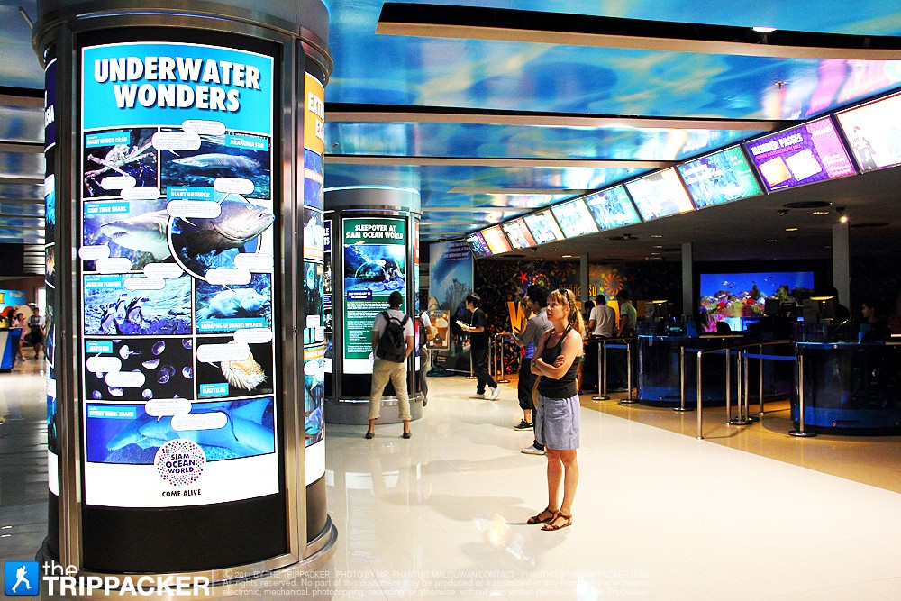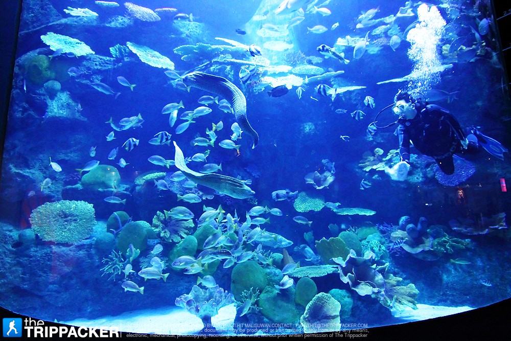 ก่อนอื่นเราไปทำความรู้จักกับ SEA LIFE Bangkok Ocean World กันก่อน ว่า ที่นี่เป็นอุทยานแสดงสัตว์น้ำที่ใหญ่ที่สุดในเอเชียตะวันออกเฉียงใต้ ซึ่งได้หยิบยื่นความแปลกใหม่ให้ได้สัมผัสกันอย่างจุใจกับทั้ง 7 โซนจัดแสดง ไล่ตั้งแต่โซนแรก ซึ่งเป็นจำพวกสัตว์ใต้ทะเลที่มีลักษณะ แปลกประหลาดและน่าอัศจรรย์ (Weird and Wonderful) เช่นปูแมงมุมยักษ์ ปลาไหลสวน เป็นต้น รับรองว่าแค่เริ่มต้นก็ทำเอาตาลุกวาวกันเป็นแถวแล้ว โซนที่ 2 จะเป็นส่วนของ แนวปะการัง (Deep Reef) ที่จัดไว้ภายในตู้ขนาดยักษ์มีความสูงถึง 8 เมตร ความพิเศษคงอยู่ที่นักดำน้ำที่แหวกว่ายอยู่ภายในแล้วคอยอธิบายข้อมูลต่างๆ ผ่านอุปกรณ์ทันสมัย เพื่อให้ข้อมูลกับผู้ชมข้างนอกได้รับรู้ ซึ่งดูแล้วก็น่าสนใจดีทีเดียว ในโซนที่ 3 หรือโซน กฎเหล็กเพื่อการอยู่รอด (Living Ocean) นี้ จะเป็นส่วนที่แสดงให้เห็นถึงการเอาตัวรอดของบรรดาปลาสายพันธุ์ต่างๆ ที่เห็นบางตัวสีสันสุดสวยหรือบางชนิดดูหน้าตาไม่ค่อยเป็นมิตรเอาเสียเลยนั้น ต่างก็มีเหตุผลเพื่อความอยู่รอดทั้งสิ้น รวมถึงยังมีกิจกรรมอย่างการลอยเรือเพื่อชมปลาฉลาม กระเบน และอื่นๆ ซึ่งเราสามารถให้อาหารปลาได้อีกด้วย และไม่เฉพาะแต่เพียงสัตว์ใต้ท้องสมุทรเท่านั้น ในโซนที่ 4 นี้เองที่เป็นส่วนของ ป่าดิบชื้น (Rainforest) ที่จำลองบรรยากาศของป่าได้ค่อนข้างเสมือนจริง รวมถึงยังมีสัตว์น้ำและสัตว์เลื้อยคลานจากลุ่มน้ำอเมซอนให้ได้เห็นอย่างมาก มาย ทว่าที่ได้ชมผ่านไปนั้นเป็นเพียงส่วนแค่หนึ่งเท่านั้น ยังเหลืออีกหลายโซนที่น่าสนใจ แต่ตอนนี้ใครอยากจะพักดื่มน้ำ ทานขนมก็เชิญแวะตามจุดให้บริการก่อนได้ แล้วค่อยมาสนุกกันต่อ