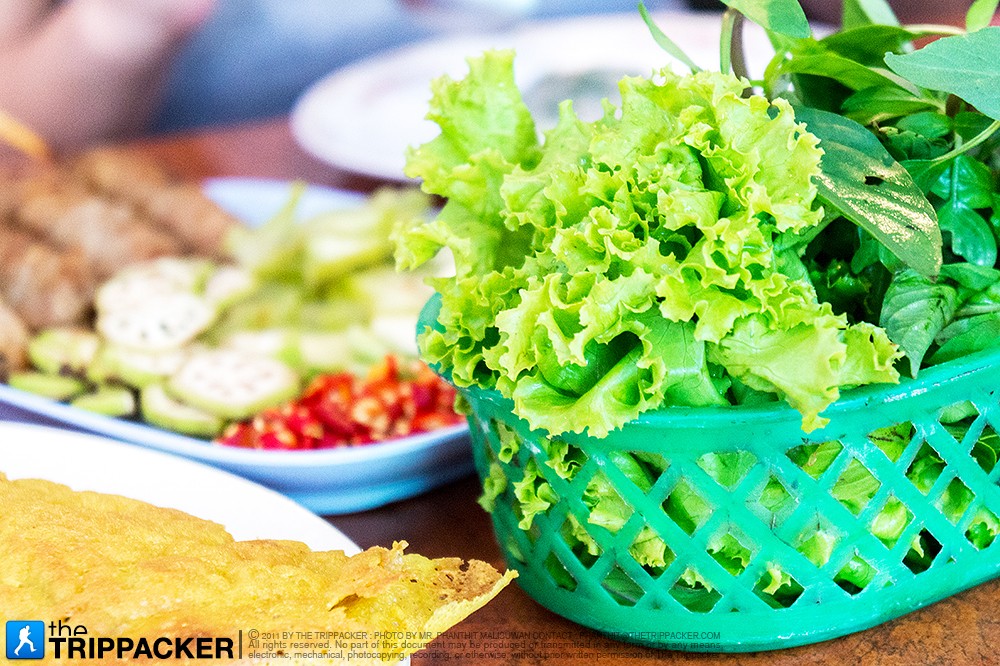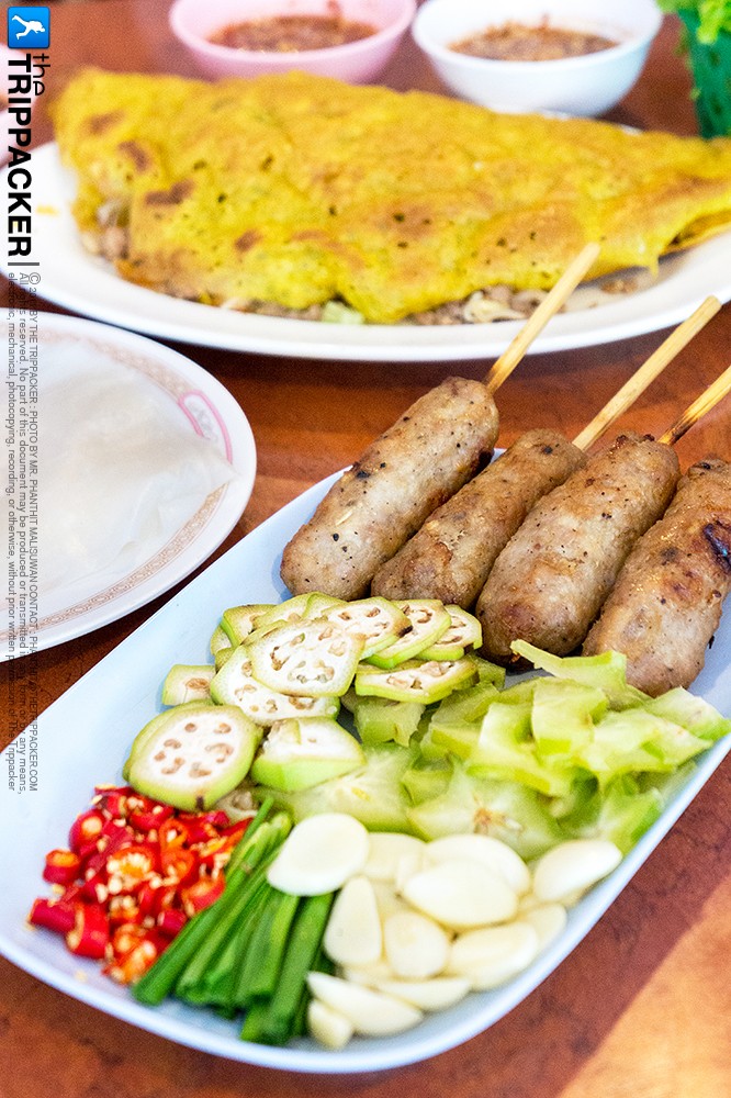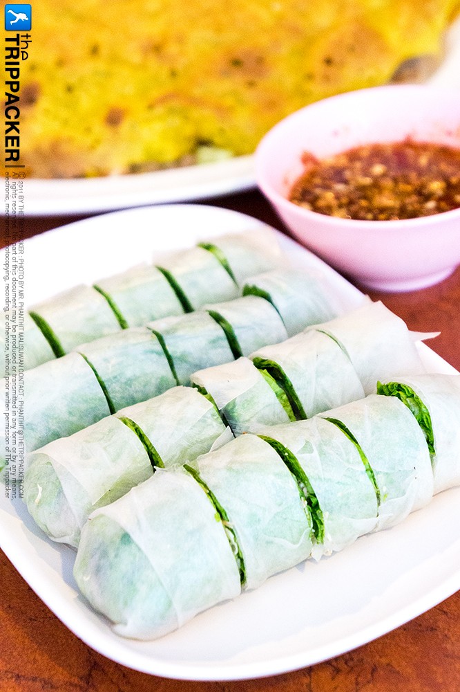 เราเริ่มต้นกันด้วย “แหนมเนือง” เมนูฮิตประจำร้านที่ใครๆ มาเป็นต้องสั่ง เวลากินเนื้อหมูพร้อมเครื่องเคียงนานาชนิด ตามด้วยอีกสารพัดผักเคี้ยวกันให้สนุกปาก น้ำจิ้มแหนมเนืองของร้านนี้ออกรสหวานอยู่ซักหน่อย แต่ถ้ากินพร้อมกันกับทั้งพริก และมะเฟืองก็ได้รสอยู่ไม่น้อย ส่วนจานต่อไปเป็น “เมี่ยงสด” หรือที่เรามักคุ้นเคยกันในชื่อป่อเปี๊ยะสดนั่นเอง ในม้วนแผ่นแป้งอัดแน่นไปด้วยไส้พร้อมผักสด กินพร้อมกับน้ำจิ้มรสหวานอมเปรี้ยวที่โรยถั่วบดมาช่วยเพิ่มความหอมมัน เมนูนี้เป็นอีกจานที่เอาใจคนรักผัก ซึ่งเราจะได้กินผักกันแบบเต็มปากเต็มคำ