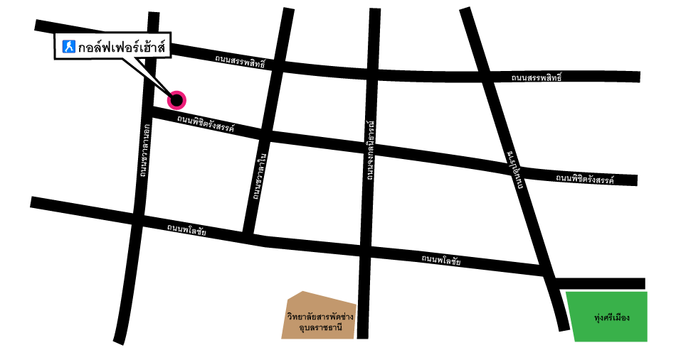 จากตัวเมืองอุบลราชธานีตรงมาผ่านหอนาฬิกาตรงมาทางสามแยกโรงเรียนสามัคคีแล้วเลี้ยวซ้ายมาประมาณ 50 เมตรจะเห็นร้านกอล์ฟเฟอร์เฮ้าส์ด้านขวามือบนถนนพิชิตรังสรรค์