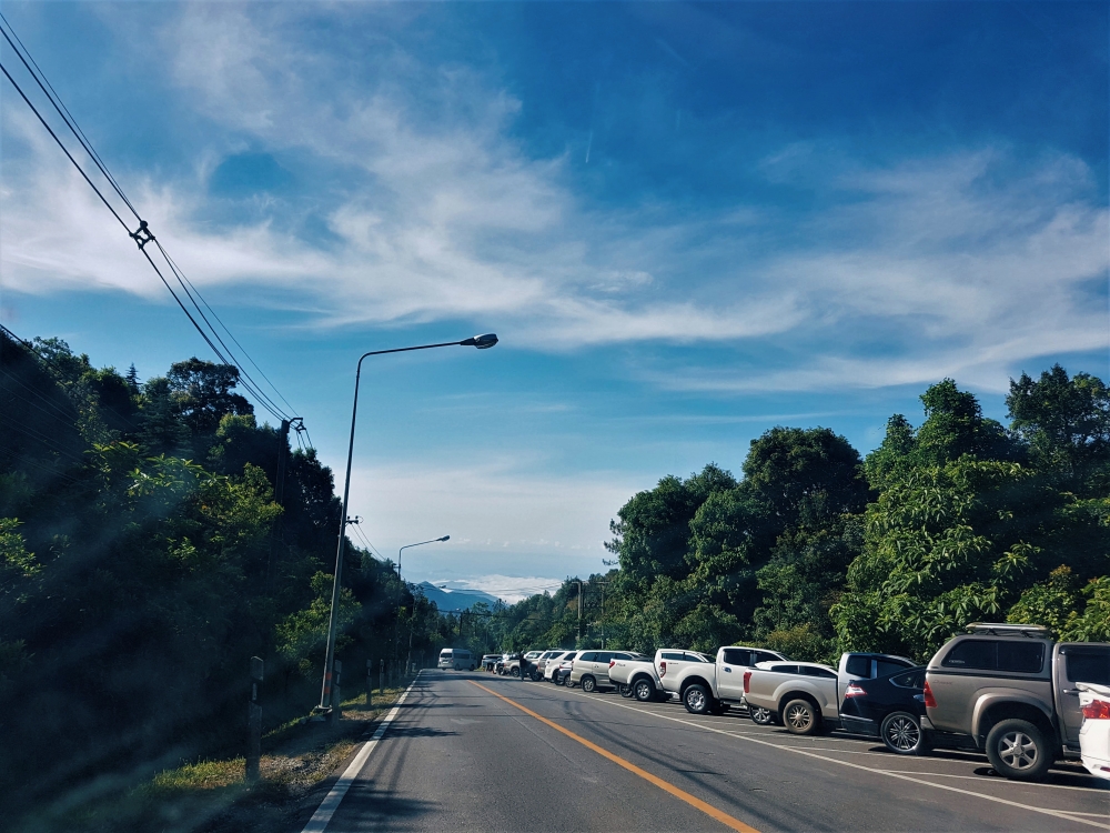 พี่ที่มารับชื่อ "พี่สมบรูณ์" ชาวบ้านแม่กลางหลวง ออกมาก็จะเจอด่านของอุทยาน ก็เริ่มมีนักท่องเที่ยวยืนมาเยอะเหมือนกันนะ เพราะเรามีจุดหมายที่เดียวกัน