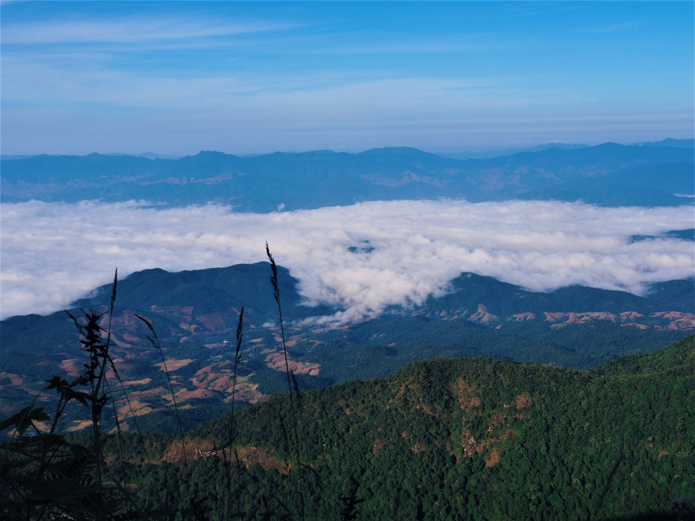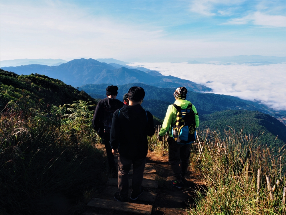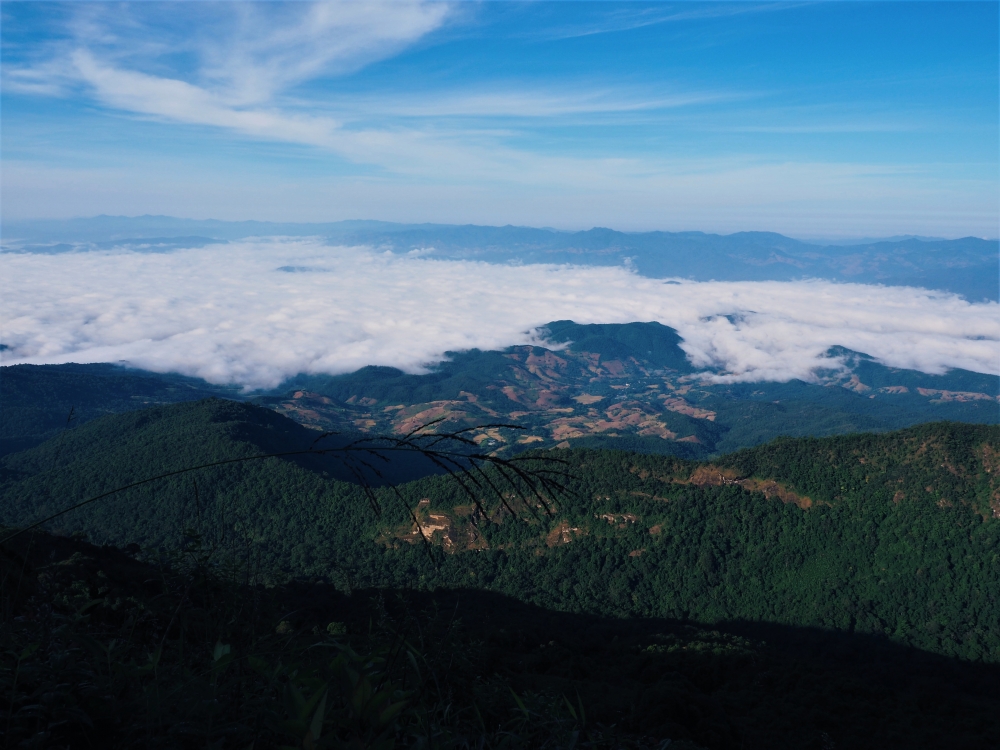 เดินมาถึงสุดทางป่าดิบชื้นโซนแรกก็จะเจอ ทุ่งหญ้าโล่งกว้างของ สันกิ่วแม่ปานซึ่งมีแสงแดดจ้า อากาศจะอุ่นๆ กว่าเดินในป่าดิบเขา