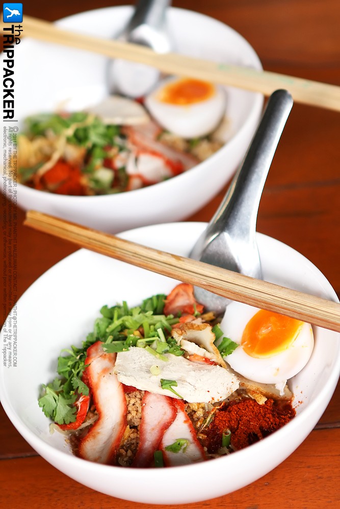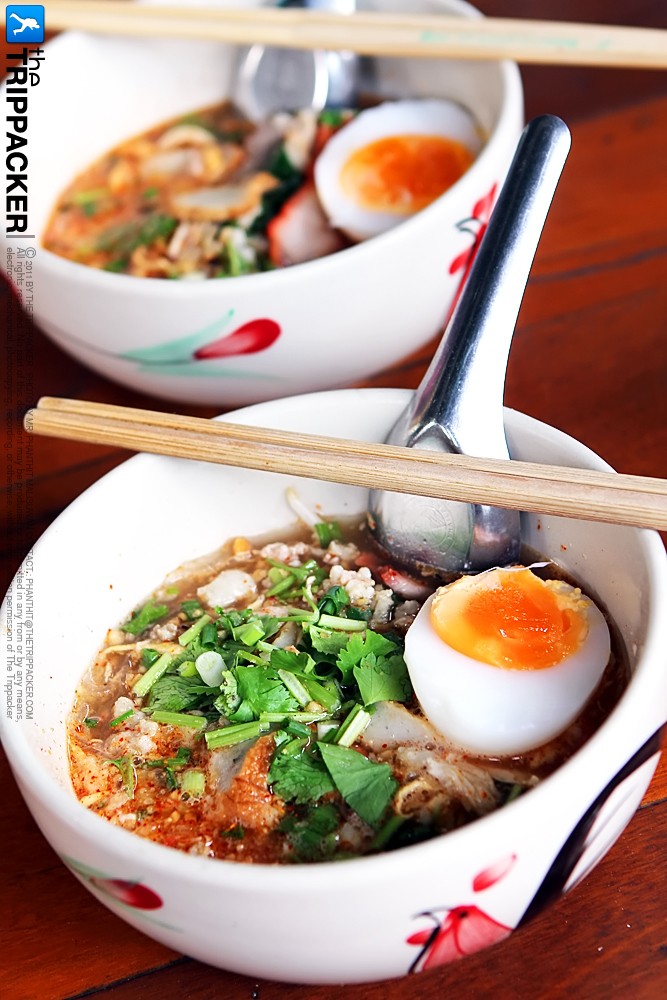 ทั้งนี้เมื่อเห็นจากหน้าตาของ เส้นเล็กต้มยำ ชามแรกที่จะลงมือชิมนั้น ถือว่าน่ารับประทานมากพอสมควร วางพร้อมมาด้วย ไข่ต้ม ซึ่งเป็นจุดเด่นเหมือนกับชื่อร้าน นอกจากนั้นยังมี กุ้งแห้ง หมูแดง หมูสับ เครื่องในหมู และ ถั่วงอก ด้านรสชาติน้ำซุปซึ่งปรุงเสร็จให้เผ็ดจัดจ้าน พอให้ได้ซู้ดปากกันพอหอมปากหอมคอ ชามถัดไปที่วางใกล้กันนั้นก็คือ บะหมี่ต้มยำ ซึ่งทีเด็ดความอร่อยอยู่ที่ความเหนียวนุ่มของตัวเส้น ด้วยสูตรเฉพาะของทางร้านที่ลงมือทำขึ้นเอง เรียกว่าทั้งสองชามนี้อร่อยแบบไม่ต้องปรุงเพิ่มเลยทีเดียว กระทั่งเมื่อ เส้นเล็กต้มยำ และบะหมี่ต้มยำ ที่สั่งมานั้นหมดจดไปเรียบร้อย แต่ทว่าความต้องการรับประทานอะไรเส้นๆ นั้นไม่ได้หมดตามไป ว่าแล้ว จึงสั่ง บะหมี่แห้งต้มยำ มาบำเรออาการอยากอีกซักชาม ซึ่งก็ไม่ผิดหวังอีกเช่นเคย เพราะแม้จะเป็น บะหมี่แห้ง ตัวเส้นก็ยังเหนียวนุ่ม แถมไม่จับตัวกันเป็นก้อน และถึงแม้ว่ารสชาติจะออกหวานนำไปซักหน่อย แต่พอได้พริกได้น้ำปลาลงไปหน่อย ก็พอทำให้รสชาตินั้นอร่อยขึ้นใช่ย่อยเลย อีกอย่างเมนูแห้งแบบนี้ทางร้านจะใส่ ไข่เจียวหั่นฝอย ลงมาในชามแทนกุ้งแห้ง ซึ่งก็เข้ากันเป็นอย่างดี