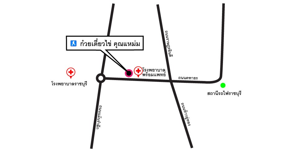 - ร้านก๋วยเตี๋ยวไข่ คุณแหม่ม ตั้งอยู่บนถนนคฑาธร ติดกับโรงพยาบาลพร้อมแพทย์