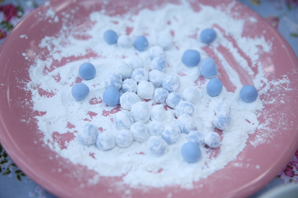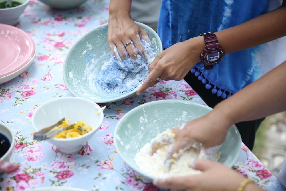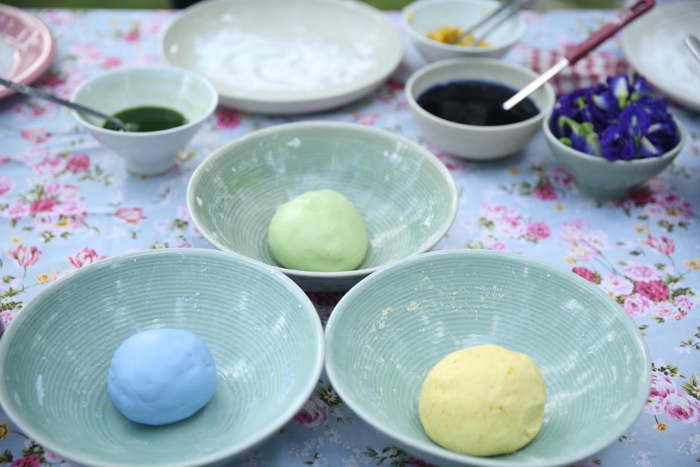 เพียงแค่แป้งข้าวเหนียวผสมกับน้ำอัญชัน  ค่อยๆ ขยำจนเป็นก้อน