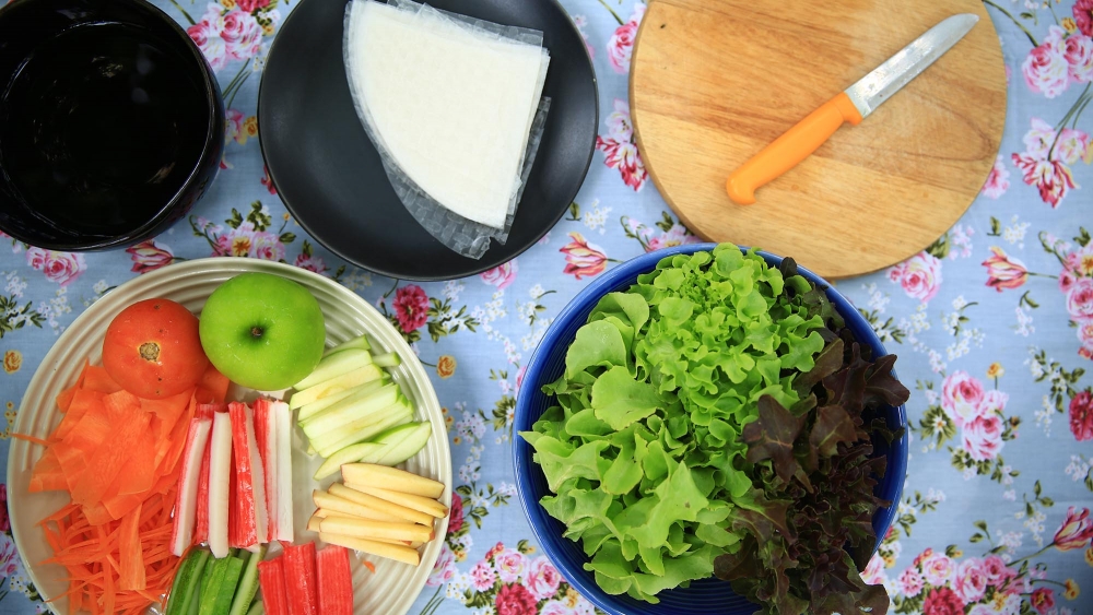 - ใช้แป้งเปาะเปี๊ยะญวน ชุบน้ำ ห่อผักทุกอย่างที่มี  จากนั้นตัดครึ่งเป็น 2 ส่วน