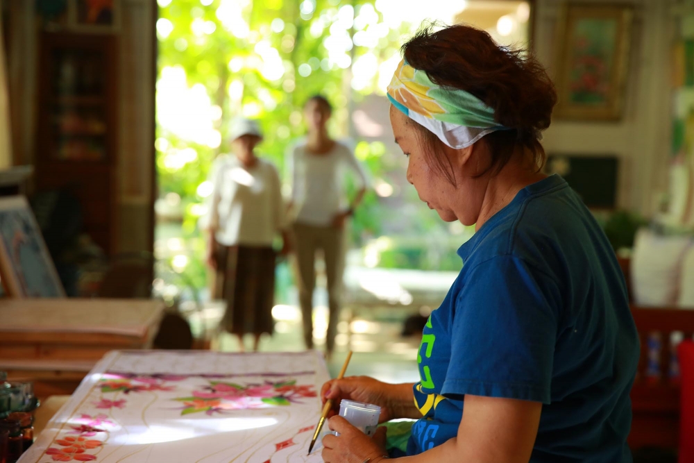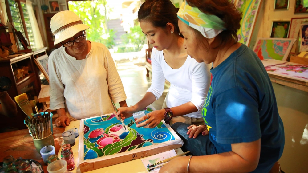 จะทำกิจกรรมแบบป้าคนไหน อย่างป้าเต่า โบว์ก็ได้เรียนรู้การทำผ้าบาติก  ทั้งสนุก ทั้งเพลินดีทีเดียวค่ะ