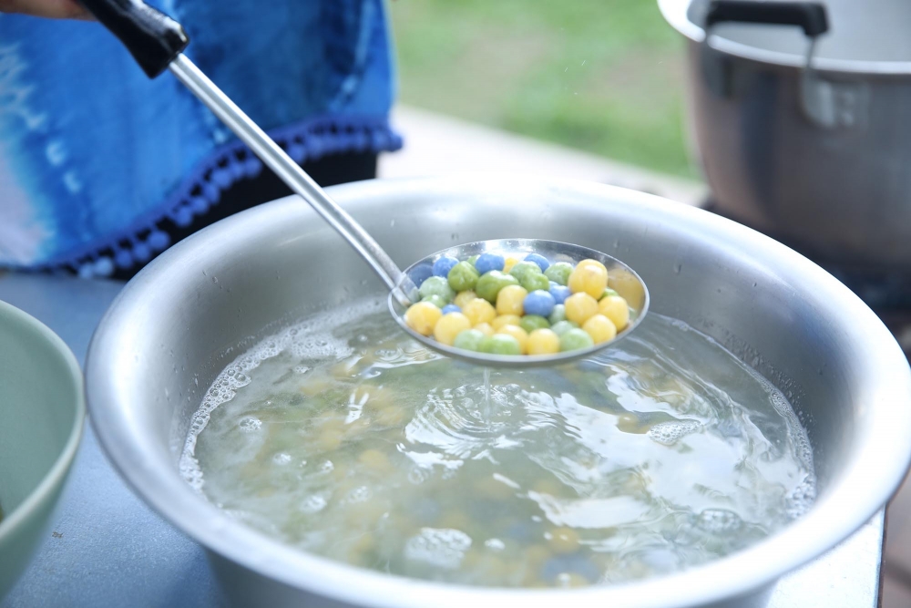 ทำบัวลอยด้วยสีจากธรรมชาติ อย่าง ใบเตย ฟักทอง และอัญชันค่ะ