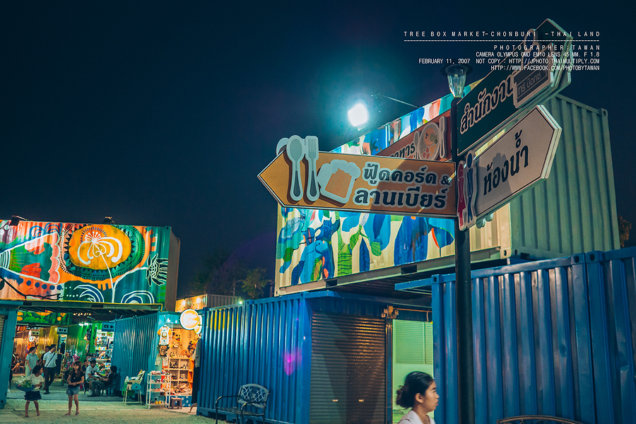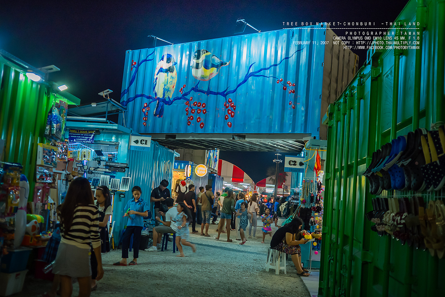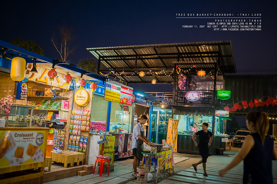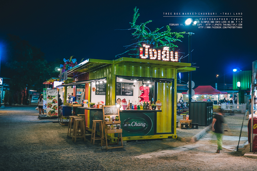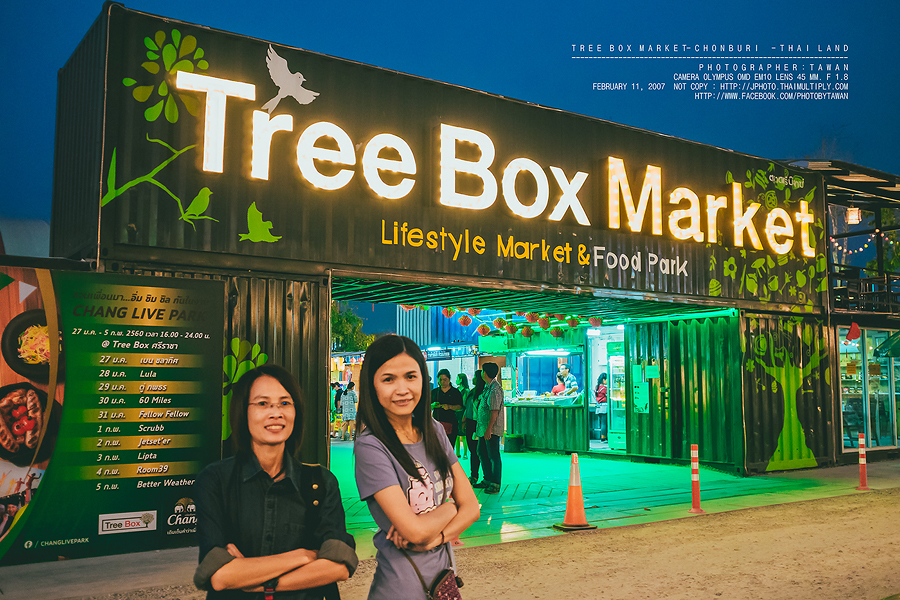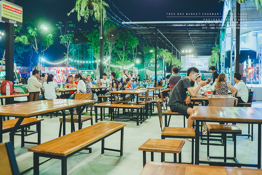 ตลาดนัดแห่งใหม่ ของอำเภอศรีราชา  ชื่อว่า Tree Box Market ตลาดนัดตอนเย็น ที่มีของกิน ช๊อป เที่ยว เดิน สบายๆ เป็นที่พักผ่อนใจหลังเลิกงานสำหรับคนทำงานมาเหนื่อยทั้งวัน ที่ต้องการหาอะไรทานอร่อยๆ เดินชิวๆ ถ่ายภาพเล่นบ้าง แล้วก็กลับไปพักผ่อน นอนหลับสบาย ลองไปเดินกันดูนะคะ พวกเราไปกันประมาณ 19.00 น. ก็เดินไปถ่ายรูปไป แต่สิ่งแรกที่ตรงไปคือ หาของกิน แหะๆ ตามไปดูกันค่ะ ว่าเราถ่ายอะไรมาบ้าง
