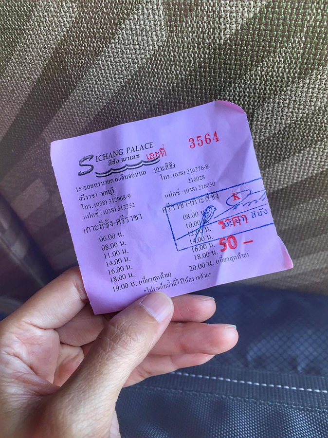 วันที่ 11 กุมภาพันธ์ 2560 หลังจากที่เราทานข้าวเช้าเสร็จ เราไปเกาะสีชังกัน โดยขึ้นเรือ เวลา 11.00 น. ใช้เวลาประมาณ 45 นาที ค่าขึ้นเรือไปเกาะสีชัง คนละ 50 บาท  ไปถึงเช่ามอเตอร์ไซค์สามล้อ เหมารอบเกาะ 250 บาท เราไปกัน 3 คน ก็นั่งสบายๆ พอดี