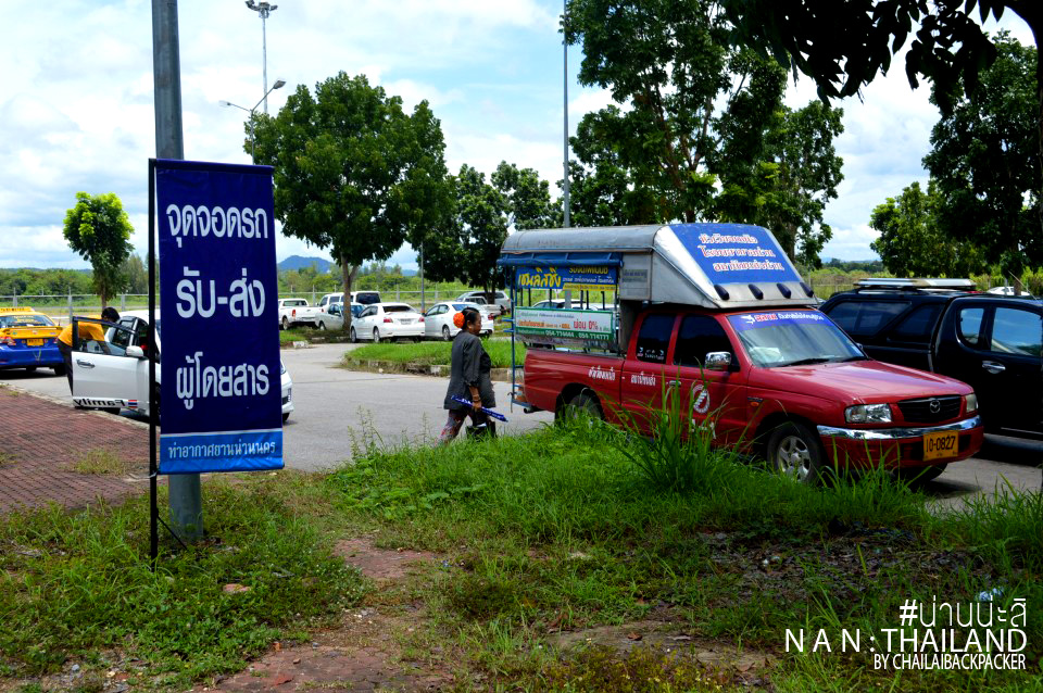 ถ้าเดินออกจากอาคารมา แล้วเลี้ยวไปทางซ้ายมือ เดินไปอีกหน่อยก็จะเห็นรถสองแถวจอดอยู่ หลังจากสอบถามราคา ก็ คนละ 50 บาท เข้าเมือง (ถ้ามากันหลายคน อาจจะได้ราคาถูกกว่านี้นะครับ พอดีเดินทางมาเข้าเมืองแค่ 2 คนเอง) และคนขับรถสองแถวก็ให้นามบัตรไว้ด้วย ซึ่งสามารถโทรให้มารับกลับไปสนามบินได้ด้วยครับ