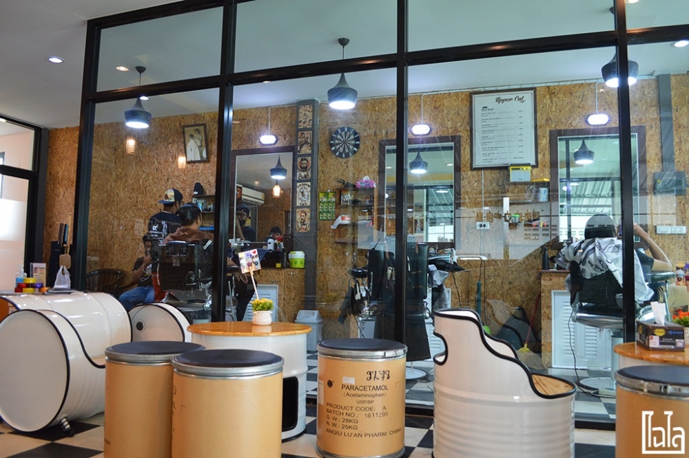 Upper Cut Café ในส่วนของร้านตัดผมสไตล์บาร์เบอร์วินเทจ ที่มีกระจกกั้นแบ่งเป็นอีกส่วน สามารถมานั่งจิบกาแฟ รอคิวตัดผม หรือ มารอคนที่มาตัดผมได้