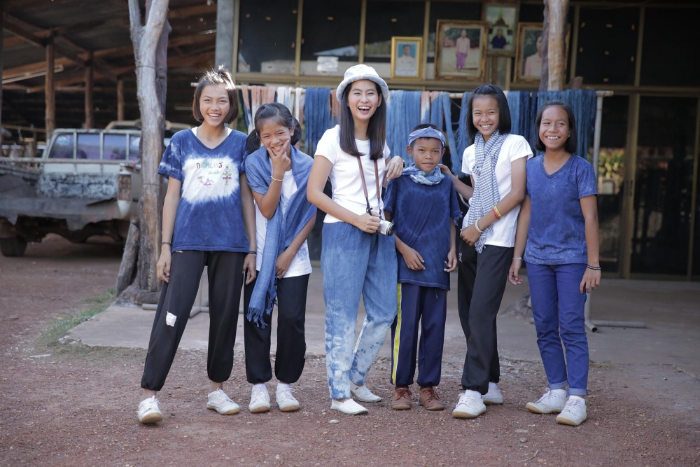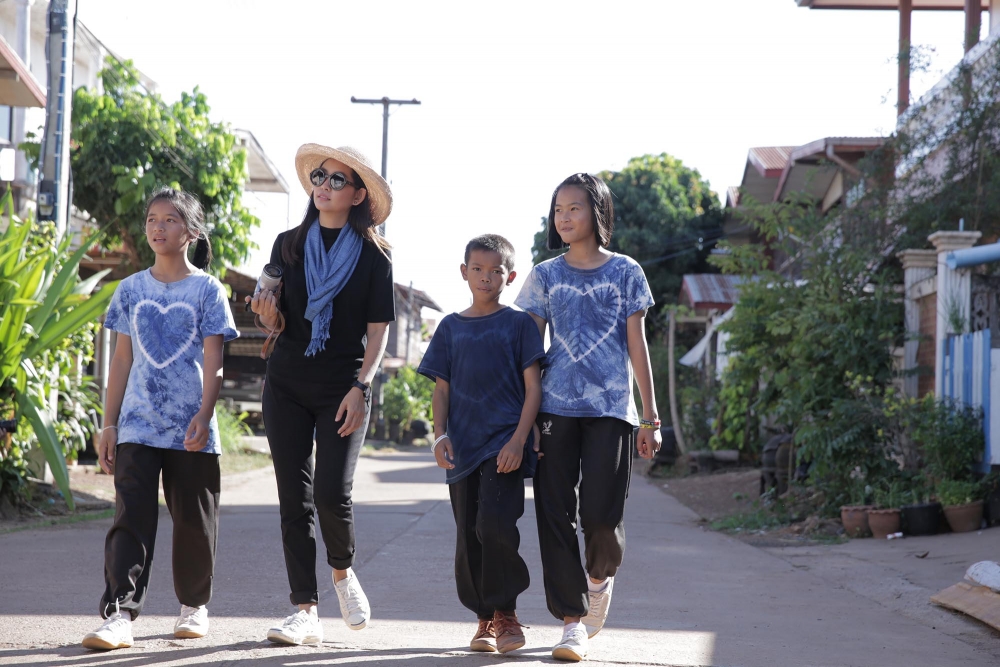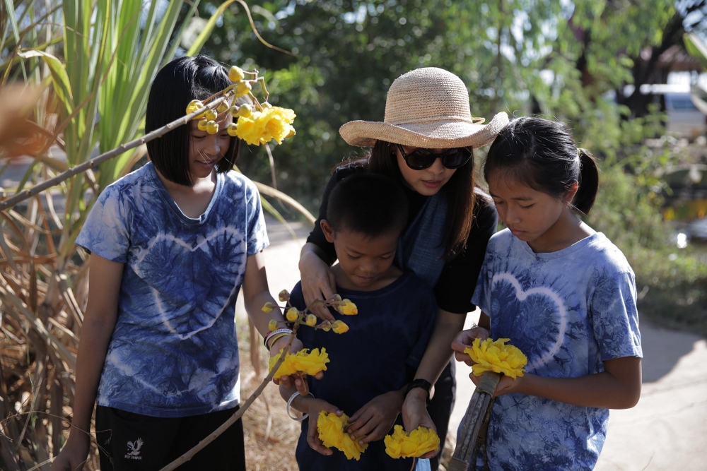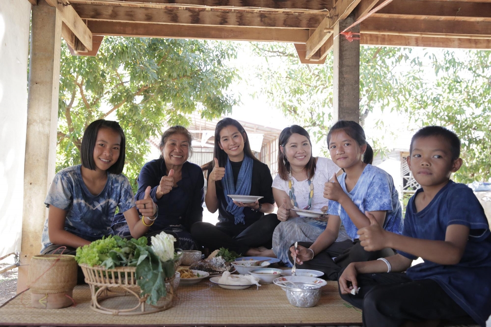 โบว์อยู่กับทีมเด็กๆ จอมแก่นแก้ว ที่หมู่บ้านถ้ำเต่า อ.อากาศอำนวย จ.สกลนคร