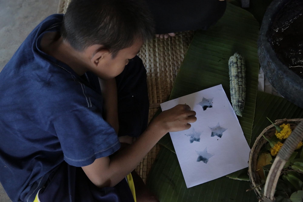 หลังจากเรียนรู้การย้อมครามเบื้องต้นจากป้าสุ่ม ป้าสุ่มก็พาโบว์มารู้จักกับ “พี่ปูเป้” หนึ่งในดีไซน์เนอร์รุ่นใหม่แห่งบ้านถ้ำเต่า เลือกจับงานผ้าครามมาประยุกต์ให้ทันสมัยและเก๋ไก๋ตามเทรนด์ในประเทศและต่างประเทศ วันนี้พี่ปูเป้รับปากว่าจะเป็นพี่เลี้ยงให้โบว์ และเด็กๆ ทำงาน DIY