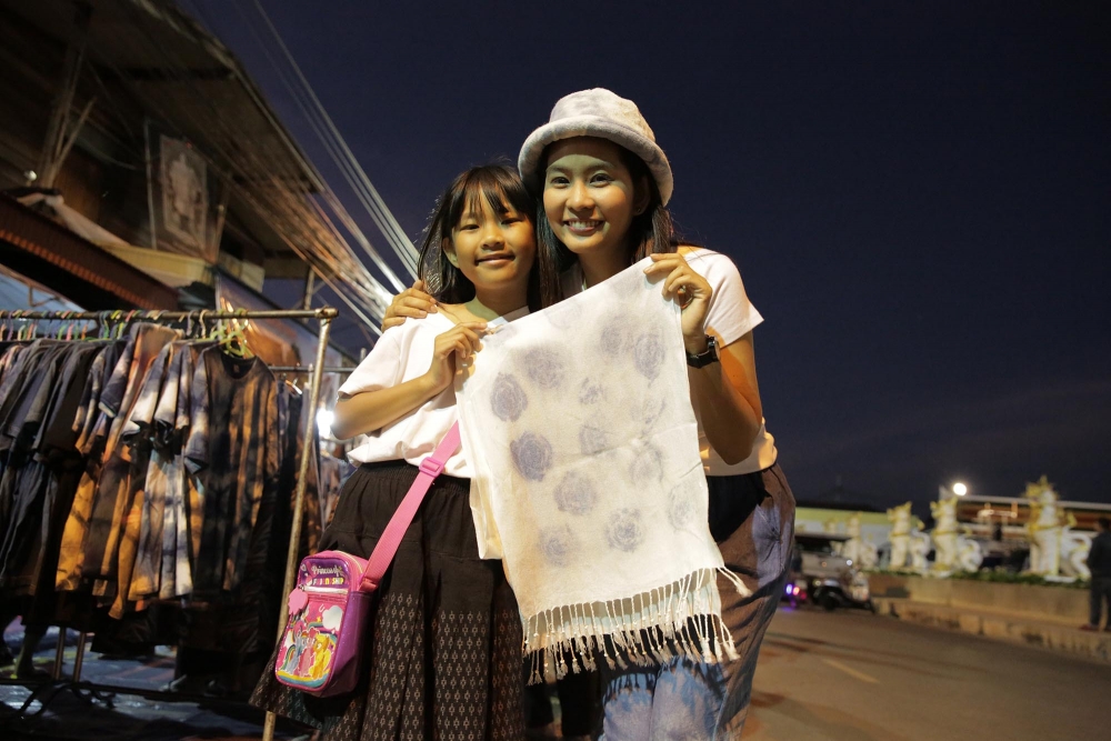 ว่าแล้วโบว์กับเด็กๆ ก็มาช่วยป้าสุ่ม และพี่ปูเป้ขายผ้าย้อมครามกับเขาด้วยค่ะ