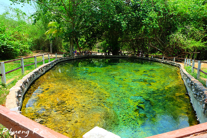 น้ำในบ่อใสสะอาด ส่วนพื้นด้านล่างเป็นสีเขียวมรกต และบางที่เป็นสีเหลือง ซึ่งเป็นตะกอนของแร่ธาตุในน้ำค่ะ ส่วนน้ำที่นี้มีอุณหภูมิถึง 49 องศา