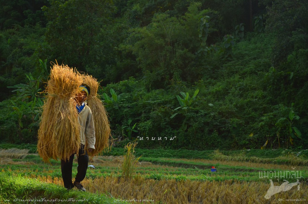 ขากลับถือเป็นโชคดีก็ได้ ตรงทางน้ำล้นครั้งแรกที่พบในเส้นทาง (พี่ผมและรถลงเล่นน้ำนั่นแหละ) ชาวบ้านที่อยู่บริเวรนั้นกำลังเก็บเกี่ยวข้าว บนนาขั้นบันไดอยู่พอดี เลยรีบวนรถกลับขับขึ้นไป และขอคุณน้า-คุณอาเจ้าของสถานที่เข้าไปเก็บภาพ ซึ่งทุกคนก็ใจดีเป็นมิตรเชื้อเชิญเราเข้าไปอย่างดี ก็เลยไม่รอช้าครับ เดินเก็บภาพเป็นเพื่อนเขาลงแขกเกี่ยวข้าวอยู่กว่า ชม. เดินประหนึ่งว่าเป็นสมาชิกในครอบครัว ต้องกล่าวขอบคุณมา ณ ที่นี้อีกรอบด้วย