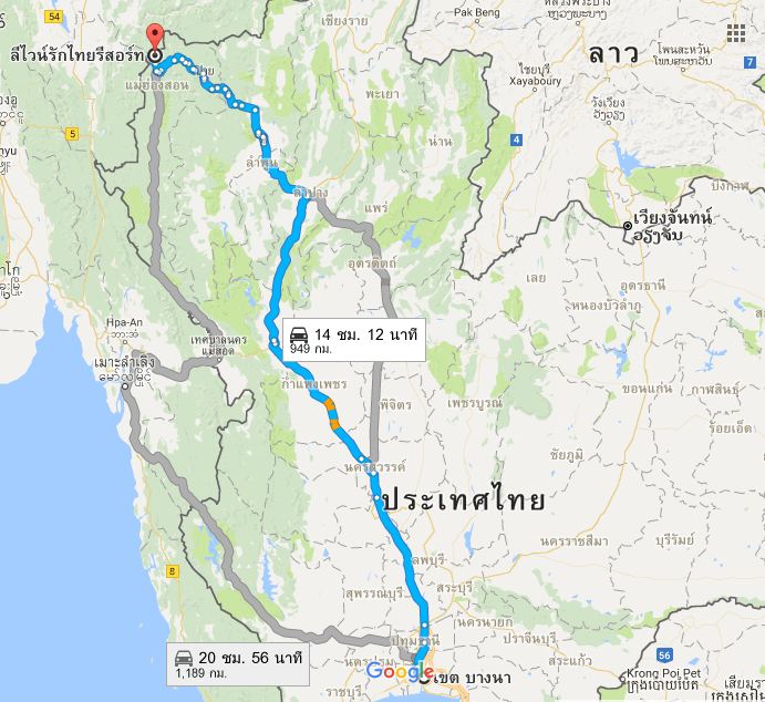 ระยะทางคร่าวๆ ที่ดูจาก GPS ต้องใช้เวลาประมาณ 5 ชั่วโมง ในการเดินทางจากเชียงใหม่ถึงจุดหมาย คือที่ ลีไวน์ รักไทย รีสอร์ท หมายความว่า ถ้าจะเข้าที่พักต้องไปให้ทันก่อนเวลา 6 โมงเย็น ตามที่ทางรีสอร์ท แจ้งเตือนมาว่าไม่ควรเข้าที่พักช้าไปกว่าเวลานี้ เพราะความไม่คุ้นชินเส้นทาง อาจทำให้เกิดอุบัติเหตุได้ ด้วยเหตุผลนี้เอง ทำให้ผมไม่สามารถแวะเที่ยวที่ไหนได้อีกแล้ว ทั้งในเชียงใหม่ และแลนมาร์คสำคัญอื่นๆ โดยเฉพาะ อ.ปาย ได้แค่ขับผ่านแต่ไม่ได้แวะ เนื่องจากจำกัดด้วยเวลา สรุปว่าวันแรกของทริปใช้เวลาอยู่แต่บนรถ ไม่ได้แวะเที่ยวไหนกันเลย นอกจากการแวะปั๊มน้ำมัน เพื่อพักรถ และกินข้าว