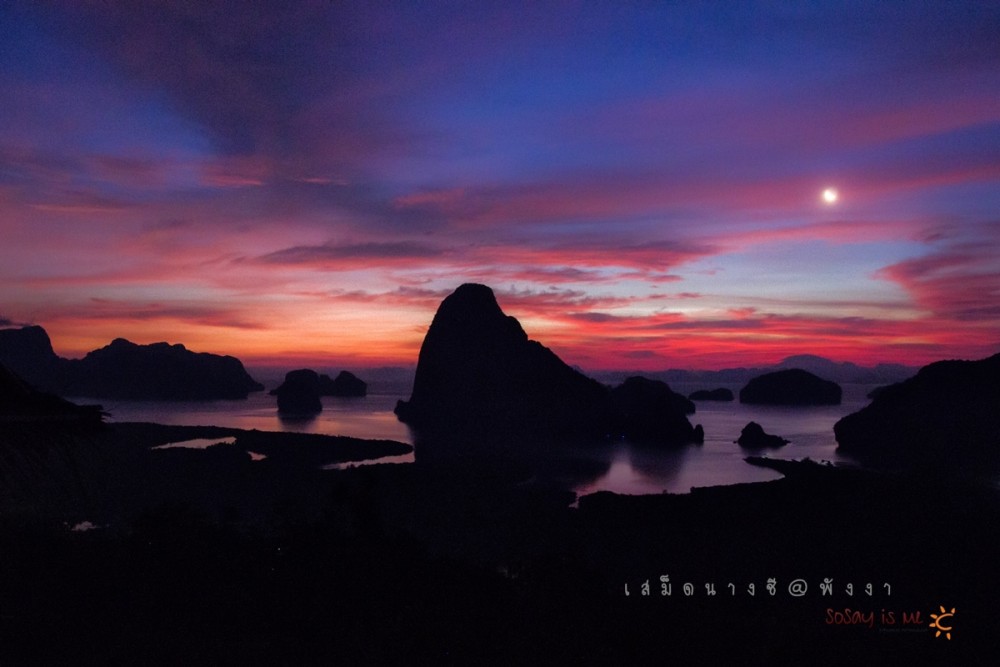 ภาพพระจันทร์สวยเด่น แม้ไม่ใช่คืนวันเพ็ญ แต่แสงนวลก็ส่องสว่าง สะท้อนผืนน้ำ .. ตัดกับแสงส้มระเรื่อจากบูรพาทิศ .. อึ้งไป 2 วินาที .. ก็รีบคว้ากล้องเก็บความอลังการตรงหน้ามาฝาก..