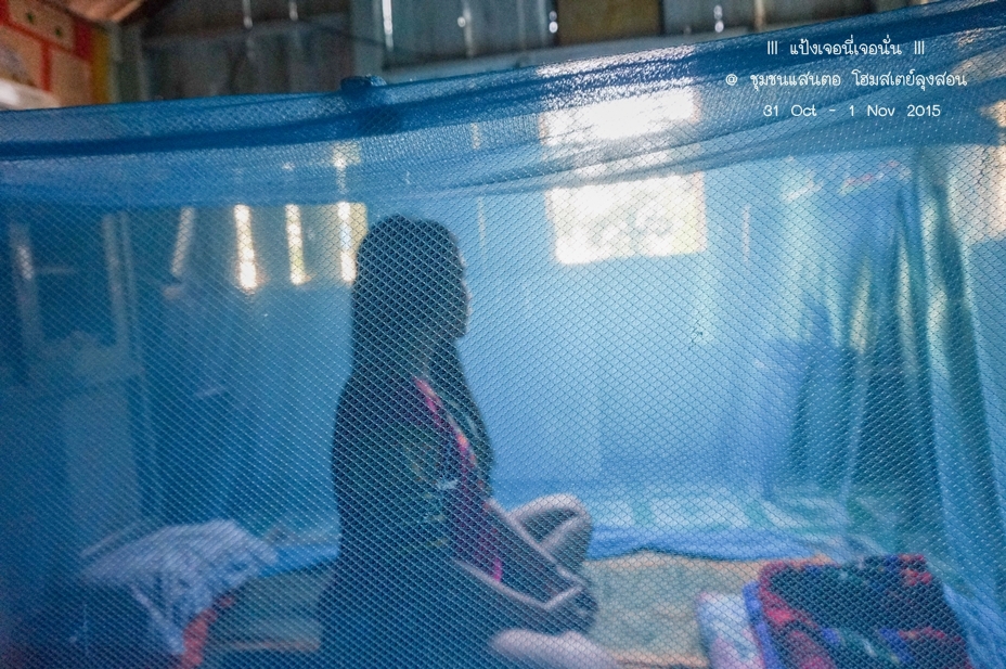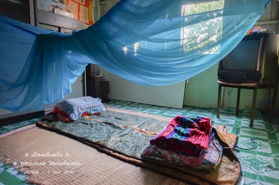 ความรู้สึกเหมือนกลับบ้าน... (เดี๋ยวๆ บ้านตัวเองยังไม่ค่อยกลับ) คุณลุงให้เราไปเก็บกระเป๋าและพาไปดูที่นอนในคืนนี้ เราได้นอนในห้องพยาบาล แต่เหมือนไม่ค่อยได้ใช้ จริงๆ แล้ว บ้านลุงสอนมีที่นอนสำหรับผู้ที่มาเข้าพักโดยเฉพาะ แต่วันที่เราไปมีพี่ผู้หญิงกับพี่ผู้ชายอีกคนเขาติดต่อมาก่อน ห้องนั้นสามารถนอนได้ 6-8 คน แต่เขามาเป็นคู่ เรามาคนเดียว เลยอัปเปหิตัวเองมานอนที่นี่ ที่ไหนก็นอนได้เราเป็นคนง่ายๆ (แต่ไม่ใจง่ายนะ) อยู่แล้ว ลุงสอนเตรียมที่นอนให้เรา เอามุ้งมากาง หาเสื่อกับถุงนอนมาปูให้ พร้อมพัดลม 1 ตัว ส่วนเครื่องนอนเดินไปหยิบได้ที่ห้องของพี่สองคน ส่วนผ้าเช็ดตัวพี่ๆ เขาหยิบมาให้