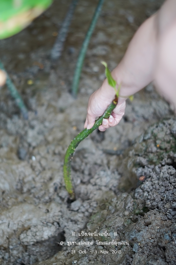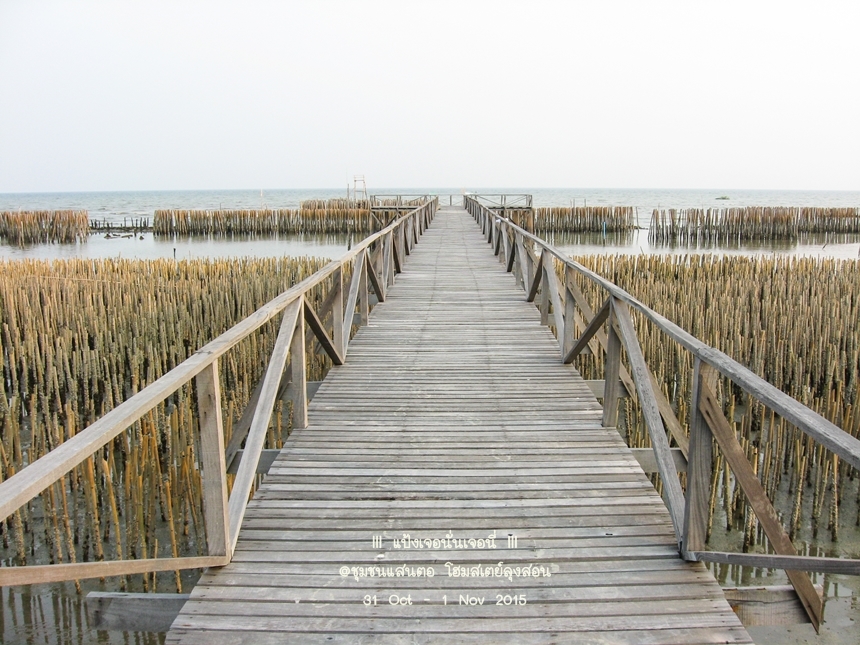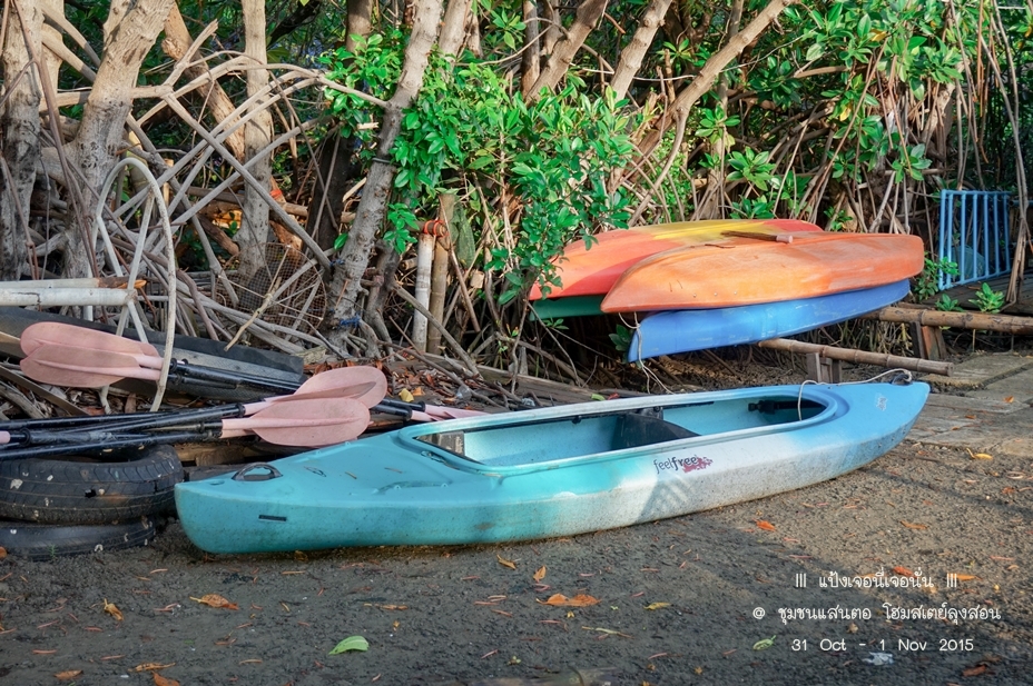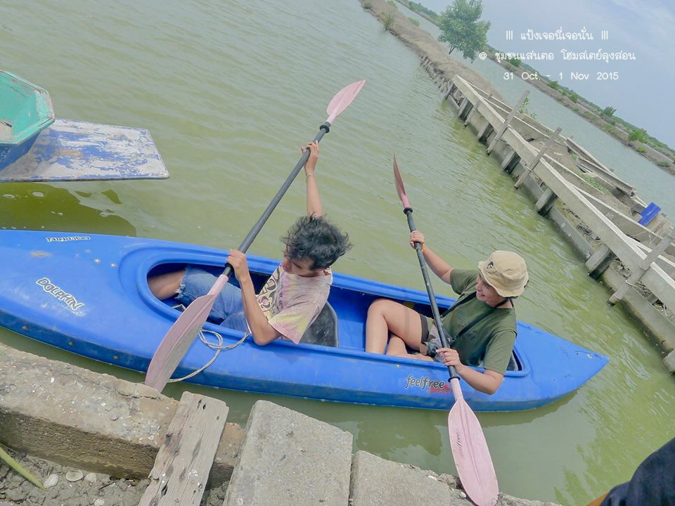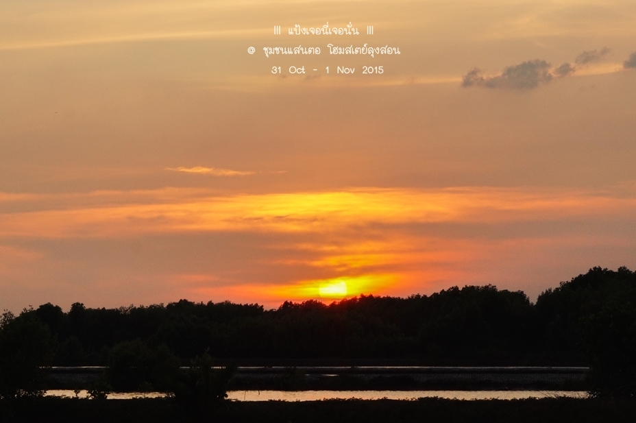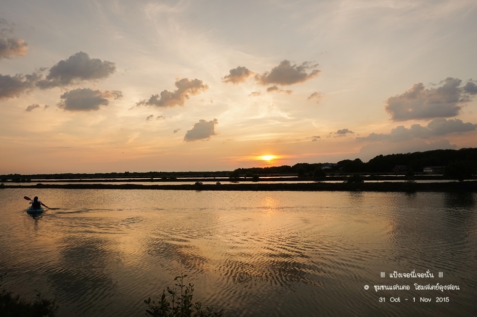 ที่บ้านลุงสอนมีคันเบ็ดค่ะ ใครอยากตกปลาสามารถพายเรือไปตกในบ่อได้   เขาว่ากันว่าผู้หญิงที่ชอบดูพระอาทิตย์ขึ้นกับพระอาทิตย์ตกเป็นคนโรแมนติกนะ (เขาที่ว่าก็เราเองแหละ อิอิ)   พระอาทิตย์ลับฟ้าไปแล้ว ความเงียบมาพร้อมกับยุง ดีนะที่พกยาฉีดมาด้วยไม่งั้นแย่แน่ๆ โดนยุงกัดแทบจะบินได้ เรานั่งคุยกับลุงสอน ระหว่างนั่งรอกินมื้อเย็น เกี่ยวกับพื้นที่ป่าชายเลนในกรุงเทพฯ ลุงสอนบอกว่าเมื่อก่อน มีพื้นที่ป่าชายเลน 2,700 ไร่ เดี๋ยวนี้เหลือแค่ 200 ไร่ ภายในระยะเวลา 10-20 ปี เป็นข้อมูลน่าตกใจมากเลย ปัญหาที่ทำให้ป่าชายเลนเหลือน้อยคือปัญหาการกัดเซาะชายฝั่ง ตอนนี้ชาวบ้านก็เอาไม้ไผ่ไปปักทำเป็นแนวกั้นคลื่น เพื่อหวังว่าพื้นที่ป่าชายเลนจะกลับมา ใกล้ๆ ก็มีเส้นทางศึกษาป่าชายเลนนะ เป็นสะพานไม้ เดินไปเรื่อยๆ จะทะลุถึงส่วนที่เป็นทะเลกรุงเทพฯ ลุงสอนบอกว่า ก่อนที่เราจะมามีนักษาจะให้พาไปเดินทางสะพานไม้ แต่ช่วงนี้ลุงสอนไม่แนะนำให้ไปค่ะ เนื่องจากยังมีฝน ยุงจะเยอะมาก ถ้าใครอยากไปรอให้หมดฝนก่อนนะ เราเคยไปมาเมื่อปี 2555 ขอนำรูปเก่าๆ มาลงให้ดูจะได้เห็นแนวกันคลื่นที่ชาวบ้านร่วมกันทำ และปัญหาการกัดเซาะชายฝั่งได้ชัดขึ้น