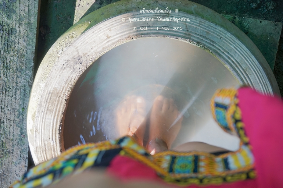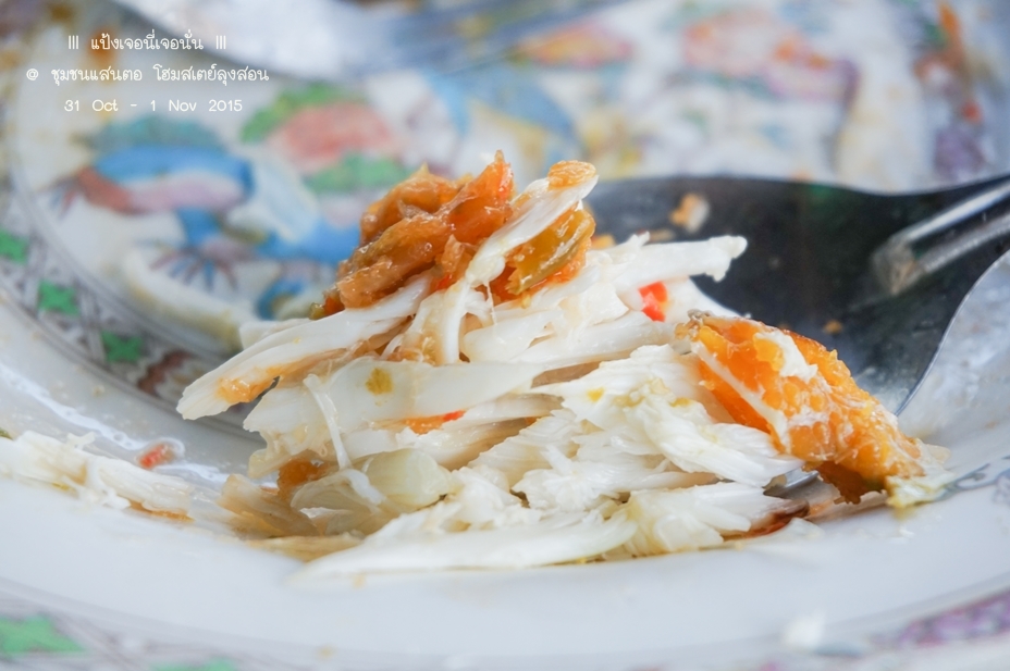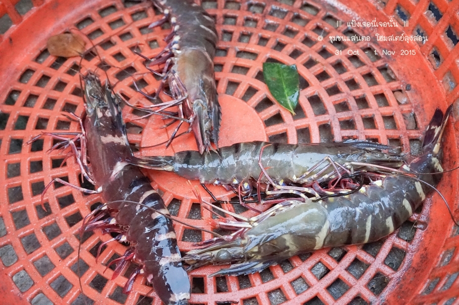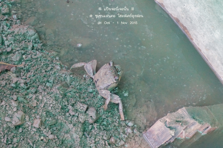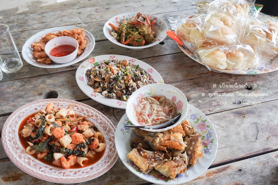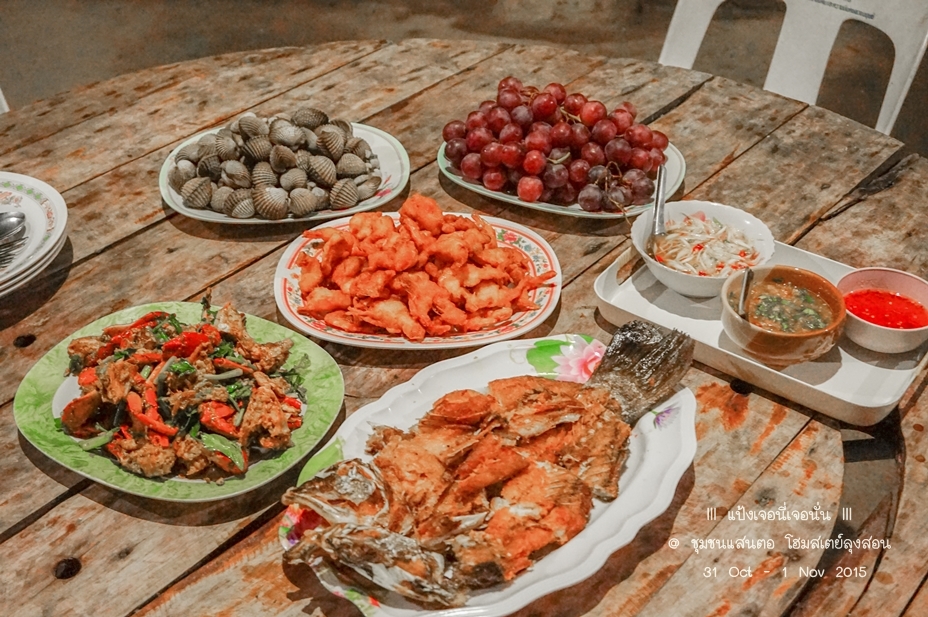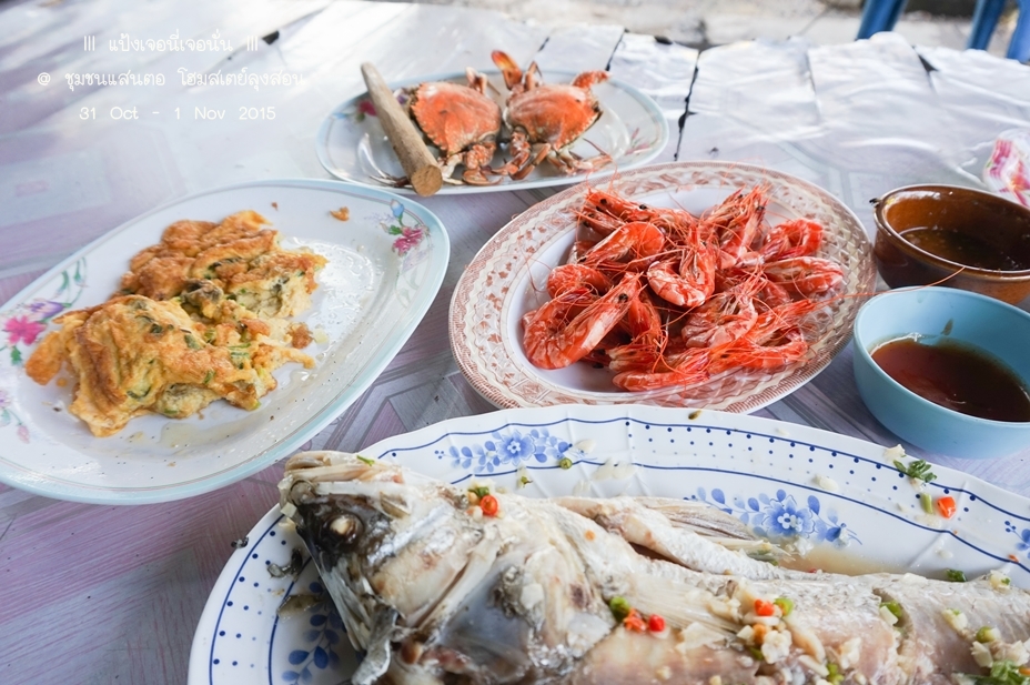 เสร็จแล้วที่นอนคืนนี้ ^^ไม่ได้นอนมุ้งมากนานมากกกกกกกกกก ตั้งแต่โลกใบนี้รู้จักกับเหล็กดัดและมุ้งลวด เข้าไปนั่งเพื่อเพิ่มบรรยากาศความหลอน ส่วนที่นอนสำหรับผู้ที่เดินทางมาพักจริงๆ หน้าตาเป็นแบบนี้ สีสันหวานแหวว ข้างๆ ที่พักเป็นแบบนี้ค่ะ ริมน้ำเลย มาดูห้องน้ำกันบ้าง มีทั้งหมด 3 ห้องค่ะ และมีโถยืนสำหรับคุณผู้ชายอยู่ด้านนอก เหมือนห้องน้ำบ้านย่า บ้านยายสมัยก่อนเลย ที่ห้องน้ำกับห้องอาบน้ำจะอยู่ด้วยกัน  พอเราเก็บกระเป๋าก็ขอขึ้นไปทักทายป้าเอื้อน เราขึ้นไปสวัสดีคุณป้า ป้าเอื้อนทักทายเราด้วยสำเนียงสาวเพชรบุรี คุณป้ายิ้มตลอด อารมณ์ดีมากๆ สักพักลุงสอนก็เดินมาถามว่า ‘แป้งกินอะไรมาหรือยัง?’ รีบบอกว่ายังก่อนเลย (แล้วข้าวมันไก่พิเศษข้างปั๊มน้ำมันตรงบิ๊กซีพระราม 2 เมื่อกี้คืออะไร ๕๕๕) ด้วยความที่เรามาช้า พี่สองคนที่มาก่อนกินกันไปแล้ว เราไม่รังเกียจที่จะกินต่อนะ เพราะอาหารทุกอย่างน่ากินมากกกกกกกกก เป็นของหนูคนเดียวด้วย ๕๕๕ ป้าบอกว่ากินให้หมดนะ เราส่งยิ้มแห้งๆ ไป แทบจะขย้อนข้าวมันไก่ทิ้ง  ป้าเอื้อนย้ำมาอีกว่า   ‘ปลาครึ่งตัวน่ะ กินให้หมดเลยนะ’   มองปลาก่อนเลย...เราไม่ชอบกินปลา แต่! เราจะมีข้อตกลงกับตัวเองว่า ถ้าไปไหนแล้วมีอาหารต้อนรับเอามาให้ด้วยน้ำใจ เราต้องรับและกินให้ได้เยอะที่สุด บางทีมารยาทกับตะกละมันก็มีเส้นบางๆ คั่นอยู่ ๕๕๕๕ มาดูดีกว่ามีเมนูอะไรบ้าง มีทั้งหมด 4 เมนู ปลานึ่งมะนาว ปูนึง กุ้งต้มเค็มหวาน และไข่เจียวหอยนางรม อย่าคิดว่าจ้องเราแบบนี้เราจะไม่กล้ากินเธอนะ!!!  เรานั่งกินข้าว ไม่ใช่สิ!!! กินกับข้าวตั้งแต่บ่ายสองหน่อยๆ จนถึง อีก 15 นาทีจะสี่โมงเย็น ๕๕๕