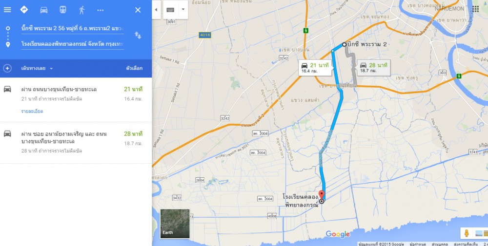 เส้นทางจากบิ๊กซีพระราม2 เราใช้จุดหมายปลายทางในการค้นหาเส้นทางเป็นโรงเรียนคลองพิทยาลงกรณ์นะ เพื่อให้เห็นว่ามาทางเส้นบางขุนเทียน-ชายทะเล