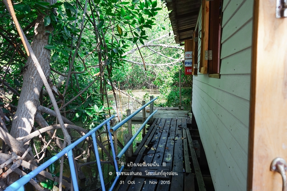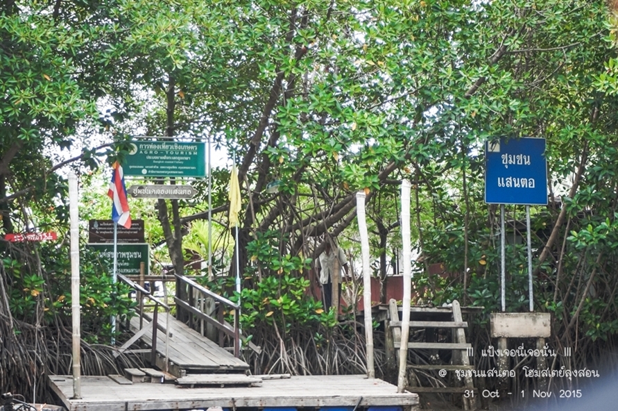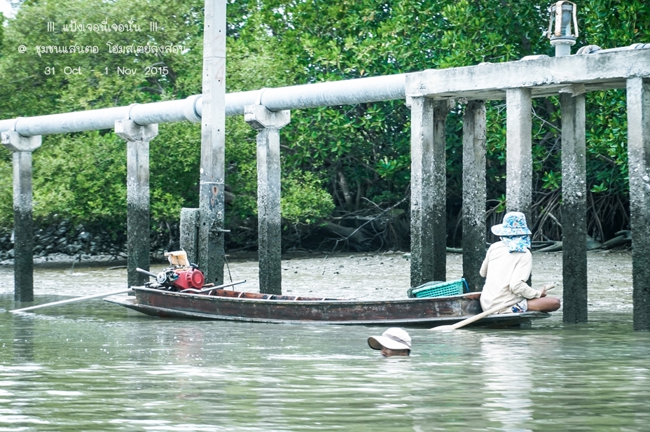 4.เหมาเรือแถวหน้าโรงเรียนเข้าไปที่บ้านแสนตอ เราเดินไปร้านค้าแถวหน้าโรงเรียนว่าจะไปบ้านลุงสอน ชุมชนแสนตอต้องไปขึ้นเรือที่ไหนคะ? เราไม่ได้ถ่ายรูปจุดขึ้นเรือมา ถามคนแถวนั้นได้ค่ะ  ครั้งก่อนที่เรามา มีป้าพาเดินไปขึ้นเรือ มากันเยอะด้วยเลยไม่ได้จำทางอะไรไว้เลย ครั้งนี้ไม่มีคนพามา แต่ชี้มือบอกว่าบ้านหลังเล็กๆ ข้างร้านขายปลาเค็ม เราไปยืนด่อมๆ มองๆ ตั้งนานไม่เห็นมีใครเลย บ้านนี้จะอยู่ติดกับบ้านที่เป็นร้านนวดแผนไทย ร้านนวดข้างๆ เห็นเราเลยถามว่ามาหาใคร? เราบอกว่าจะเหมาเรือไปชุมชนแสนตอ เขาก็บอกให้เราเดินเลาะข้างบ้านไปที่ท่าเรือเลย พอถึงท่าเรือก็ไม่เห็นใคร บ้านก็เงียบ ถ้าเจ้าของบ้านออกมาเห็นจะโดนยิงไหมก่อน? ลองพูดคนเดียวเสียงดังๆ ‘มีใครอยู่ไหมคะ?’ ก็เงียบ...เลยหน้าด้านยืนรอ ตีหน้ามึนอยู่ที่ท่าน้ำ สักพักมีความเคลื่อนไหวในบ้าน เราเลย สวัสดีค่ะ ก่อนเลย (กลัวโดนยิง) เดินเข้าไปเจอคุณลุง รีบบอกเลยว่า ‘จะไปชุมชนแสนตอ บ้านลุงสอน คุณลุงไปไหมคะ?’ คุณลุงพยักหน้าถามว่าเรามากี่คน เราบอกว่าคนเดียว คุณลุงคิด 100 บาทค่ะ (ครั้งก่อนมากัน 5 คน 150 บาท แต่ไม่ใช่ลุงคนนี้นะคะ) เราเป็นคนบอกลุงสอนว่าจะเหมาเรือเข้าไปเองเพราะเคยมาแล้ว ถ้าไม่เคยมาลองถามลุงสอนก่อนว่าสะดวกมารับที่ท่าเรือตรงโรงเรียนไหม? การเดินทางอาจจะดูยุ่งยากไปนิด แต่รับรองว่าถึงแน่ๆ