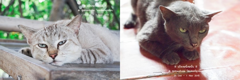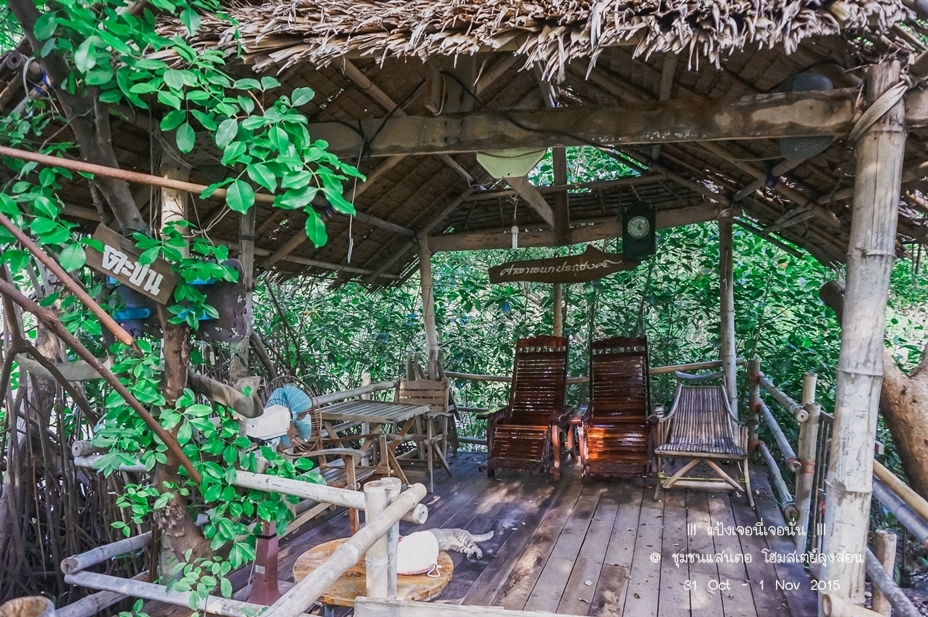 ตรงท่าเรือจะมีศาลาให้นั่งพักผ่อน ข้างๆ กันมีชิงช้า  มีฝ่ายต้อนรับด้วย (นี่คือหน้าตาต้อนรับแขกแล้วใช่ไหม?) ตัวดำชื่อน้องตุ่น อีกตัวชื่อน้องนวล ช่วงน้ำลดใครอยากปลูกต้นโกงกางก็เดินเก็บฝักใต้ต้นเลย แล้วหาที่ปักลงไป ภาพนี้เป็นส่วนหลังบ้านค่ะ