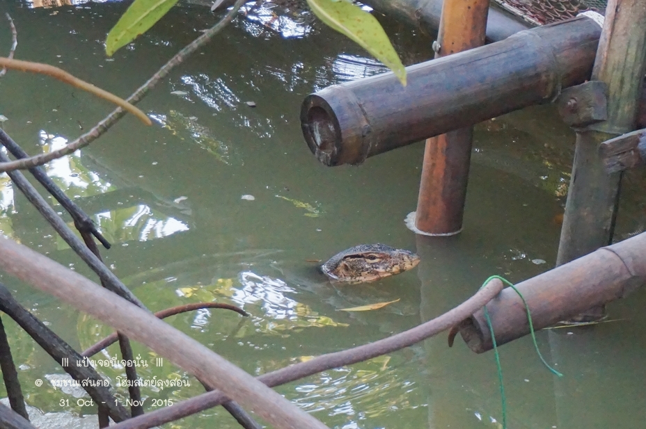 เรือที่เหมาเข้ามาลุงขับซิ่งมาก (เพิ่งเคยเห็นเรือใช้แก๊ส) มันก็สนุกดีหรอก แต่ช่วงนี้น้ำมันขึ้นอ่ะ เราว่ายน้ำไม่เป็น เสื้อชูชีพอย่างหวังว่าจะมี แต่เราก็มั่นใจนะว่าคนแถวนี้ต้องขับเรือเก่งกันทุกคนเพราะเกิดและโตมากับสิ่งแวดล้อมแบบนี้ (เอ๊ะ! ลุงแกเป็นคนแถวนี้ใช่ไหม?) มาครั้งนี้ต่างจากภาพความทรงจำครั้งที่แล้วเพราะเป็นช่วงน้ำขึ้น ริมคลองจะเป็นบ้านที่มีเสาสูงๆ สลับไปกับต้นโกงกาง มีเครื่องมือดักสัตว์น้ำให้เห็นบ้าง