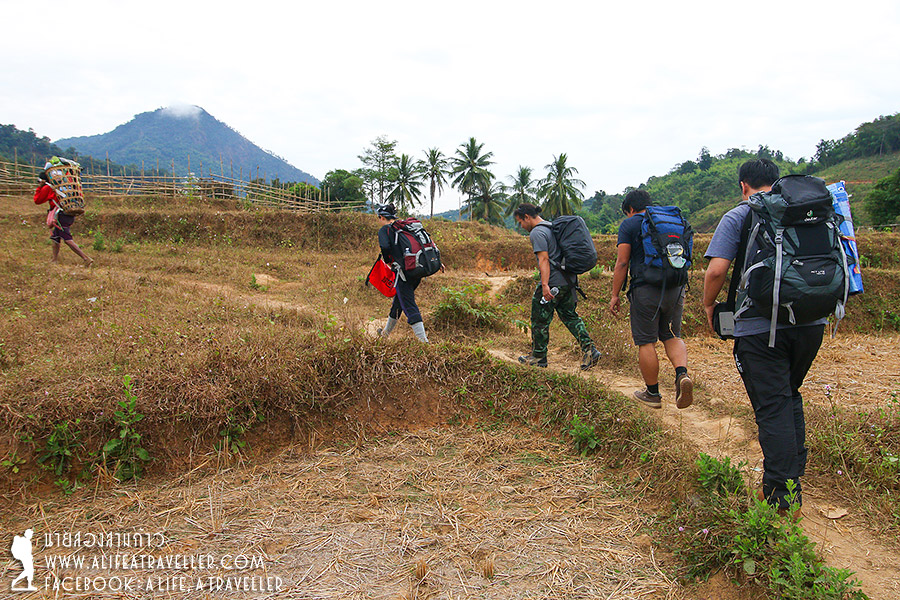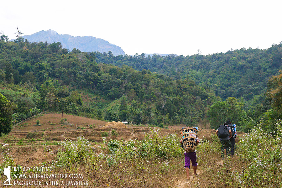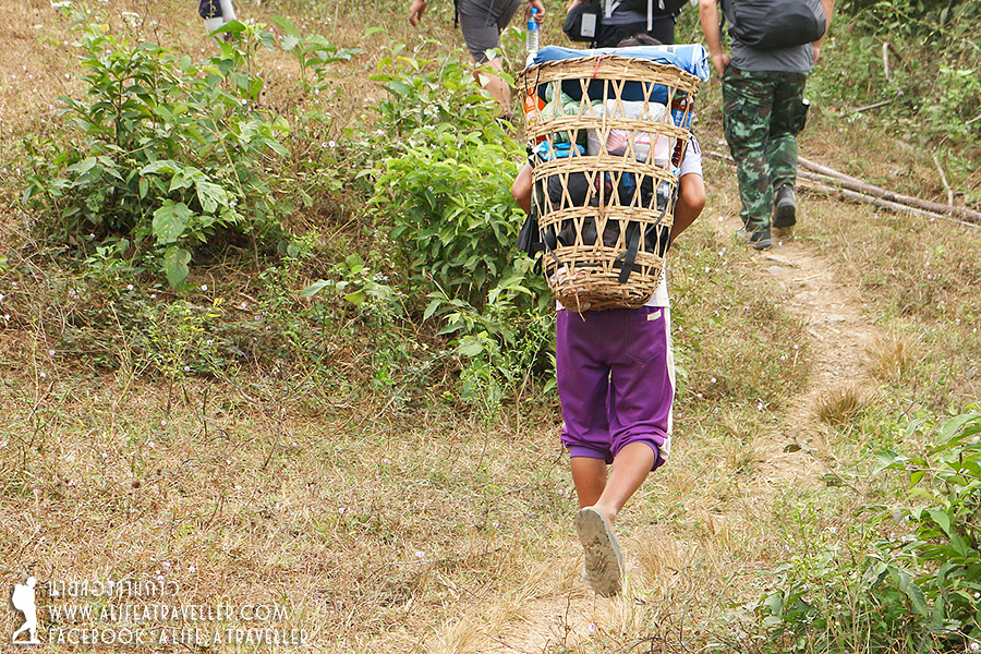 ลูกหาบชาวกะเหรี่ยงบางคนพูดไทยได้ บางคนพูดไม่ได้ แล้วแต่ดวงครับ ของผมคุณลุงพูดไทยไม่ได้ ยังดีน้องเด็กหนุ่มพอคุยกันรู้เรื่อง ถามว่าเริ่มเดินตอนนี้ (11.15 น.) จะถึงกี่โมง ระยะทางประมาณ 7 กิโลเมตร น้องรับหน้าที่เป็นล่ามคุยกับลุงแล้วตอบมาว่า... ห้าโมงเย็น