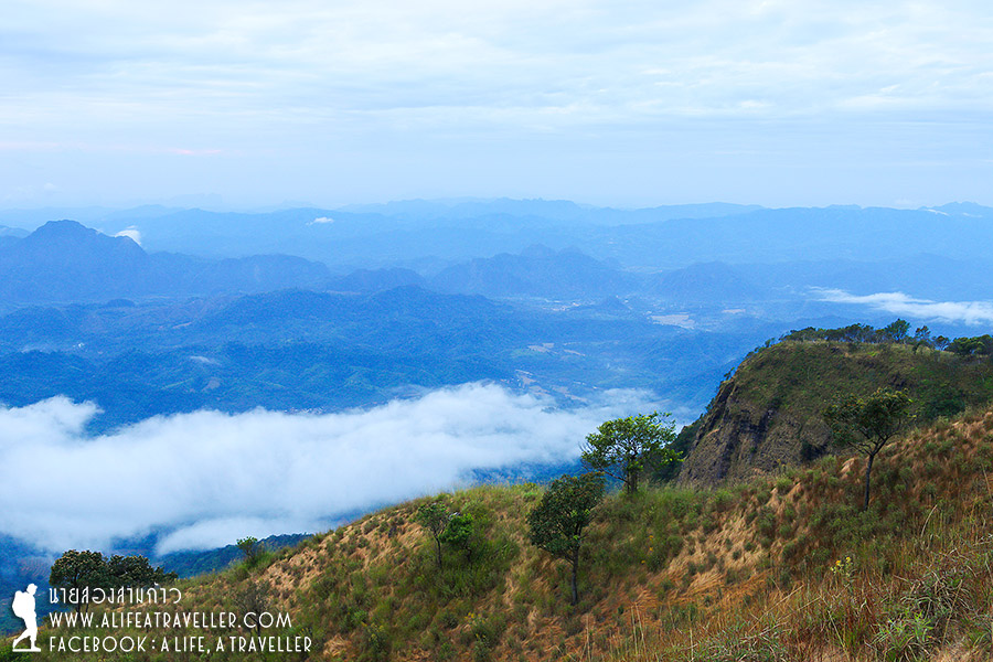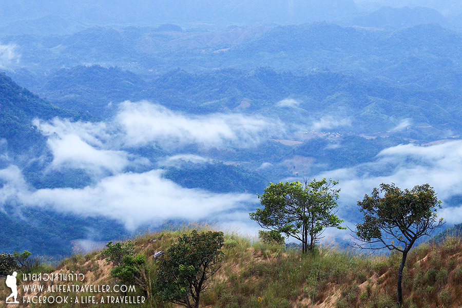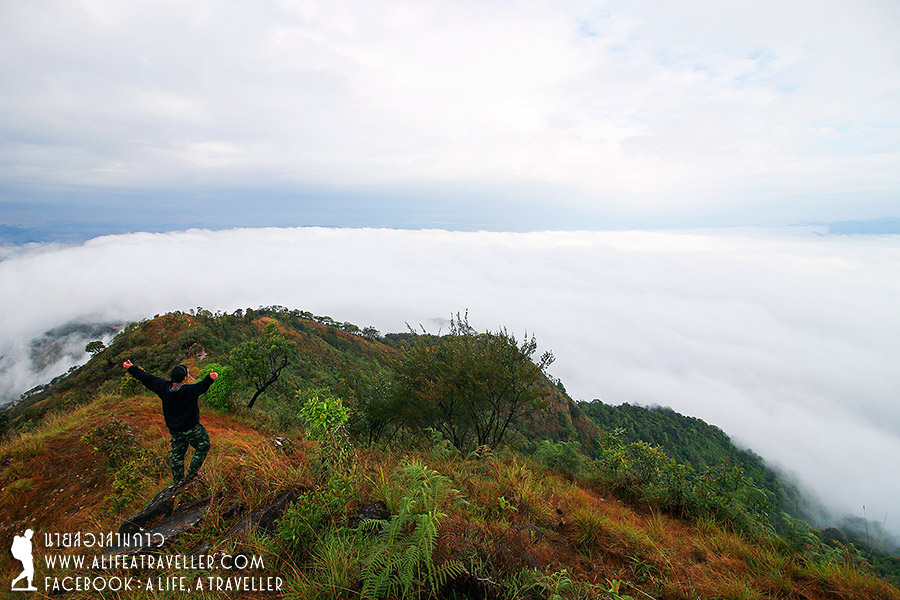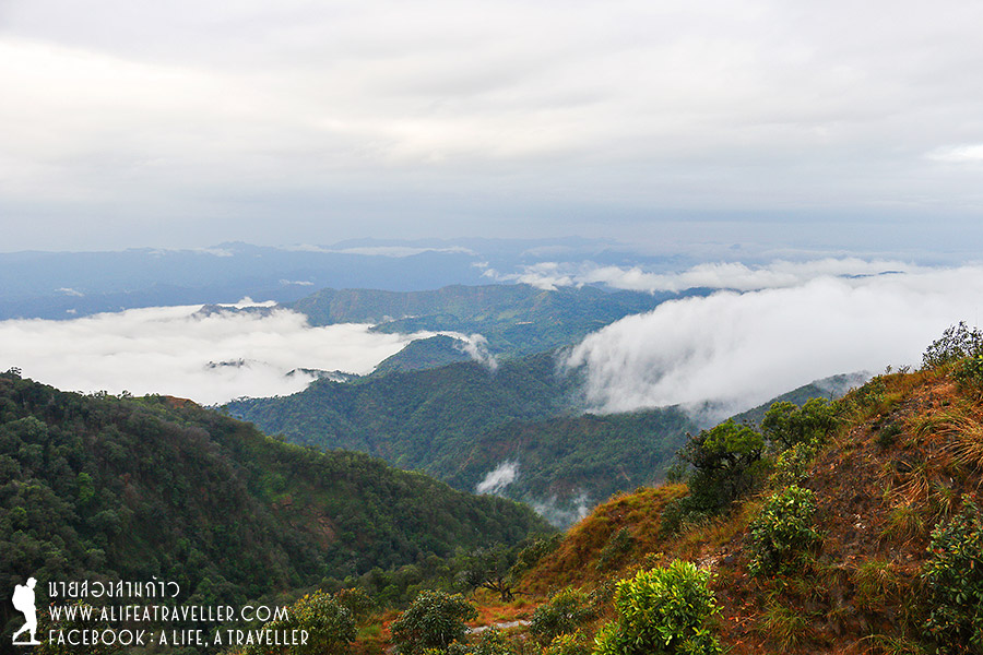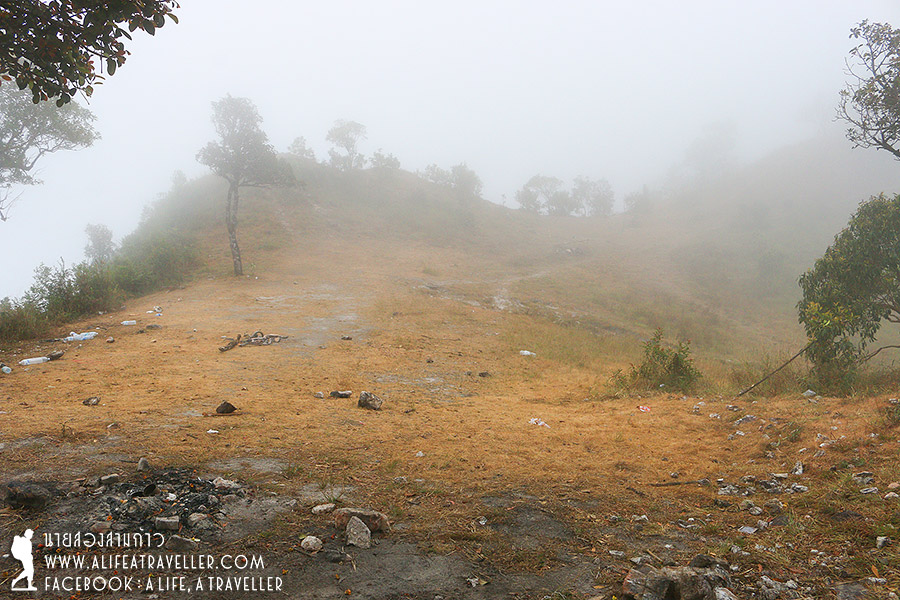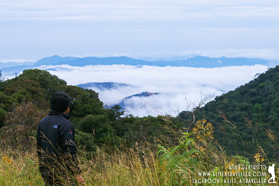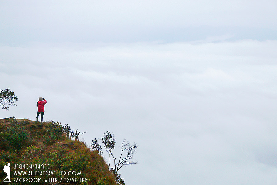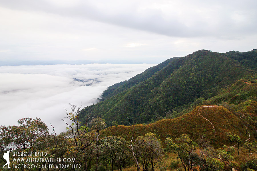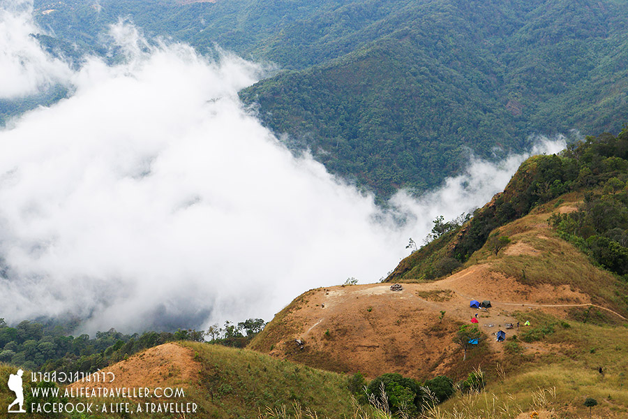 ผมเดินชมทะเลหมอก เลาะจากลานกางเต็นท์ถ่ายรูปแกะรอยความสวยมาเรื่อยๆ จนถึงยอดเขา บอกได้เลยว่าดั่งสวรรค์ แม้ไม่มีแสงอาทิตย์ แต่ทะเลหมอกแผ่ขยายกว้างไกลสุดลูกหูลูกตา ครอบคลุมฝั่งทิศตะวันออกเกือบเต็มพื้นที่ ส่วนอีกฝั่งสวยไม่ใช่น้อย สดชื่นกับผืนป่าและภูเขา หมอกวันนี้ห่มคลุมม่อนคลุยจนไม่เห็นอะไรแน่นอน จุดนี้มองกลับไปยังลานกางเต็นท์และเส้นทางเดินมาของเรา เห็นได้ว่าทางชัดเจนมาก