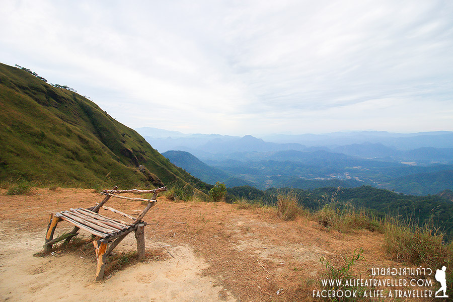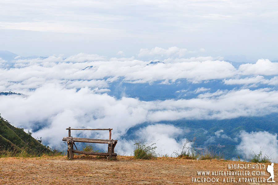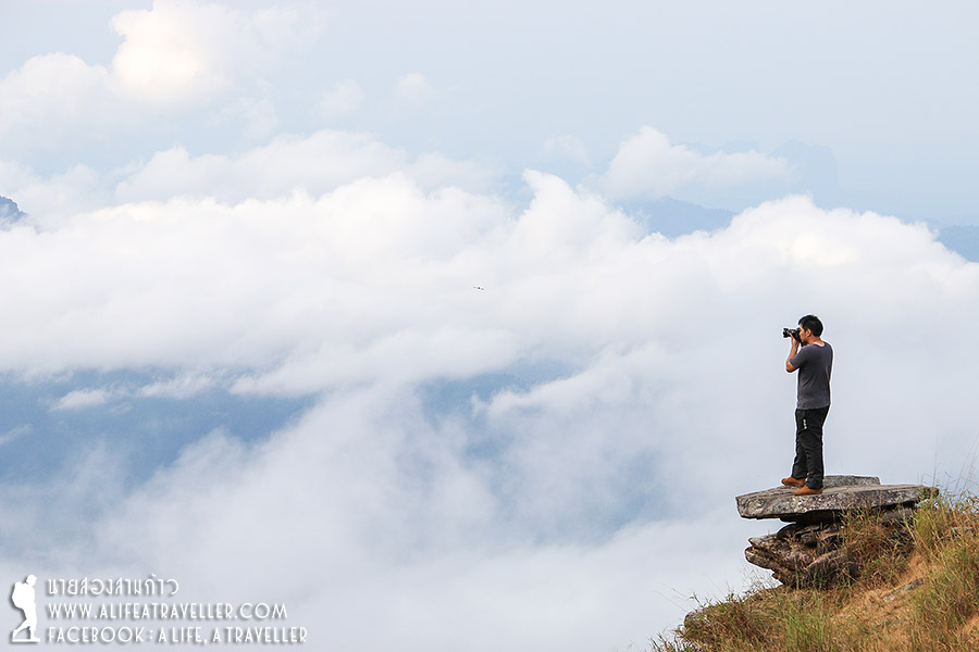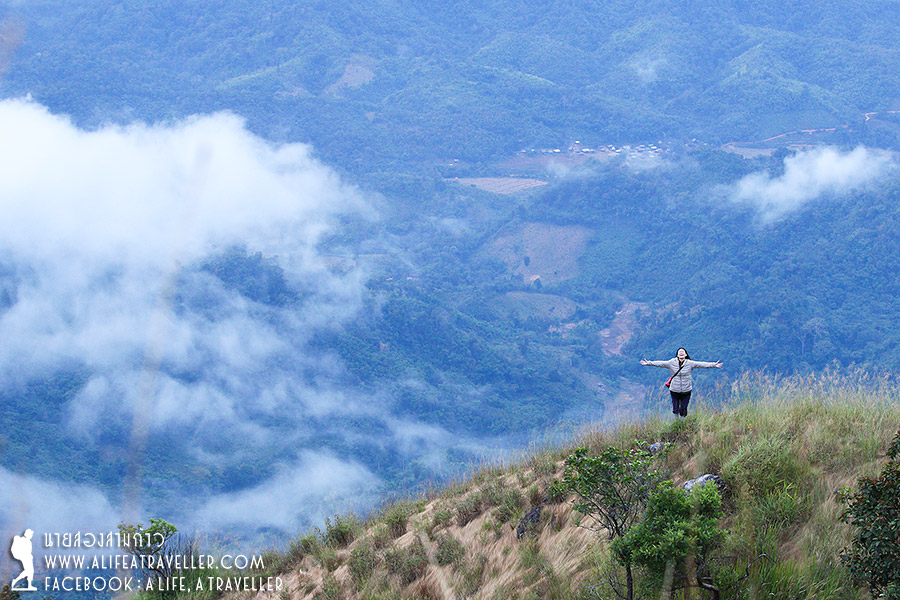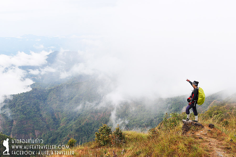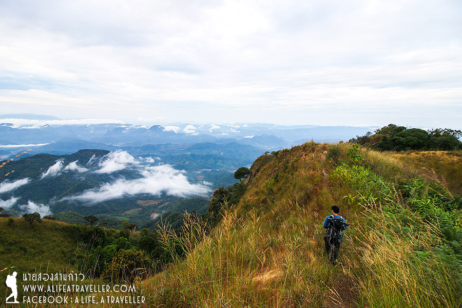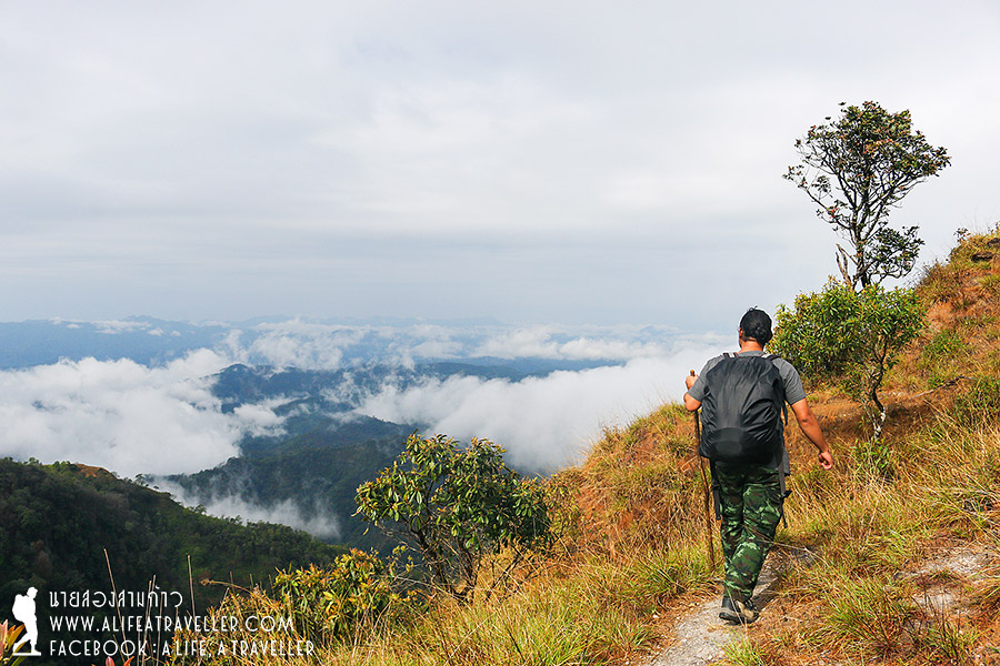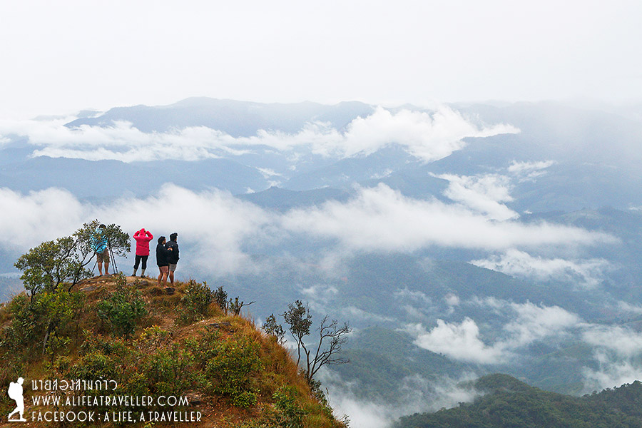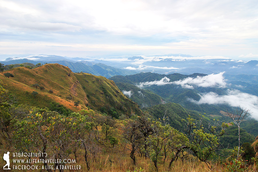 ผมเดินชมทะเลหมอก เลาะจากลานกางเต็นท์ถ่ายรูปแกะรอยความสวยมาเรื่อยๆ จนถึงยอดเขา บอกได้เลยว่าดั่งสวรรค์ แม้ไม่มีแสงอาทิตย์ แต่ทะเลหมอกแผ่ขยายกว้างไกลสุดลูกหูลูกตา ครอบคลุมฝั่งทิศตะวันออกเกือบเต็มพื้นที่ ส่วนอีกฝั่งสวยไม่ใช่น้อย สดชื่นกับผืนป่าและภูเขา หมอกวันนี้ห่มคลุมม่อนคลุยจนไม่เห็นอะไรแน่นอน จุดนี้มองกลับไปยังลานกางเต็นท์และเส้นทางเดินมาของเรา เห็นได้ว่าทางชัดเจนมาก