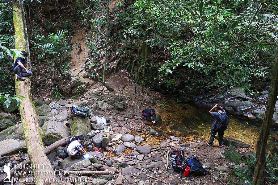 เที่ยงสี่สิบเดินลงมาถึงธารน้ำตรงนี้ครับ กรอกใส่ขวดกันให้เต็มที่ (ลูกหาบจัดการ) จากตรงนี้เหลืออีกนิดเดียวจะถึงยอดคลุยหลวง แต่เป็นช่วงทางชันโหดสุดๆ เล่นเอาต้องพักหลายรอบ ทั้งที่ระยะทางไม่กี่ร้อยเมตร บ่ายโมงครึ่ง มาถึงแล้วลานกางเต็นท์ เห็นสภาพตอนแรกอึ้งไปเหมือนกัน ไม่ใช่เพราะหมอกหนาขาวโพลนและฝนตกพรำๆ นะครับ ทว่าเพราะขยะเจ้าปัญหากระจัดกระจายเต็มลานยิ่งกว่าที่ทูเลเสียอีก จะจัดการให้หมดคงต้องจัดเป็นทริปเก็บขยะโดยเฉพาะล่ะนี่ บ่ายสามโมงท้องร้อง หลังช่วยกันตั้งแคมป์ก็ต้มมาม่าดีกว่า ฟ้ายังปิด ลมพัดพา ฝนตกเป็นระยะอยู่ตลอด จนกระทั่งห้าโมงครึ่งหมอกถึงเริ่มบางลงบ้าง เราต้องฉกฉวยโอกาสให้มากที่สุด ช่วงฟ้าเปิดหลังหมอกฝนพ้นผ่านนี่สวยงามทุกครั้งจริงๆ บนคลุยหลวงไม่มีใครอื่นนอกจากกลุ่มเรา เป็นเจ้าของภูเขากันเลย ถึงฝนตกก็ไม่มีปัญหาครับ แออัดหลบอยู่กันใต้ฟลายชีทอบอุ่นดี