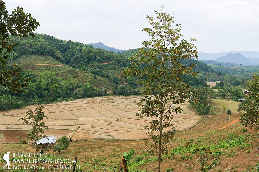 เราเริ่มเดินจากหมู่บ้านแม่จวาง ผ่านทุ่งนาซึ่งตอนนี้มีแค่ดินแห้งๆ เห็นยอดทูเลอยู่ตรงหน้า พอขึ้นมานิดหน่อยมองย้อนกลับไปวิวสวยดีนะนี่ ช่วงนาเขียวคงสดชื่น เท่าที่ฟังจากใครหลายคนต่างบอกว่าม่อนทูเลโหดใช้ได้ แต่ตอนเริ่มเดินผมไม่ค่อยอยากเชื่อเท่าไหร่ เพราะหนุ่มลูกหาบของเราล่อรองเท้าแตะแบบนี้เลย พอเริ่มเข้าเขตป่า ทางจึงเริ่มชันขึ้น เดินไป ชันไป หอบไป ลิ้นห้อยไป เหนื่อยเอาการครับ ถือว่าโหดสมคำร่ำลือ ทางราบและทางลงพอมีอยู่บ้างบางช่วงไม่มากนัก ดีนะที่อากาศแปรปรวนช่วงนี้ครึ้มฟ้าครึ้มฝน หากแดดดีเหมือนฤดูหนาวปกติคงต้องมีตายกันไปข้าง เราเดินแบบไม่เร่งมาก เหนื่อยก็พัก เมื่อยก็นั่ง จนบ่ายสองโมงสี่สิบ มาถึงตรงนี้เป็นขอนไม้พิเศษครับ จุดให้เรานั่งพักทำใจเพราะจากนี้เป็นต้นไประดับความชันจะอัพเลเวลขึ้นอีกเท่าตัว (ฮา...) หนักแค่ไหน ดูสภาพกันเอาเอง พอสูงขึ้นเรื่อยๆ วิวเริ่มสวย ความเหนื่อยไม่หายไปไหนหรอกนะ แต่ได้ความตื่นเต้นอะดรีนาลีนสูบฉีดช่วยกระตุ้นให้มีกำลังขึ้นนิดหน่อย วิวสวยๆ ทำให้ต้องหยุดพักถ่ายภาพบ่อยๆ ช่วยได้เหมือนกัน