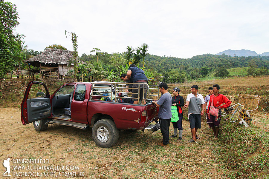 รอแล้วรอเล่า จนบังเอิญมีมอเตอร์ไซค์ชาวบ้านขี่มา ผมเลยยืมขี่ไปหาจุดมีสัญญาณโทรศัพท์ ถึงได้เรื่องว่ารถมารอรับรอบนึงแล้ว เราไม่ลงมาสักทีเลยกลับไปทำธุระก่อน ตอนนี้กำลังออกจากบ้านท่าสองยางมารับใหม่ ค่อยโล่งอกหน่อยคิดว่าจะโดนเทเสียอีก