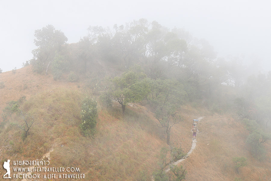 เราเดินจากคลุยหลวงตามทางไปม่อนคลุย ส่วนใหญ่เป็นทางลง ระหว่างทางหมอกเริ่มฟุ้งเพราะลมพัดพามองดูสวยดีอีกแบบ