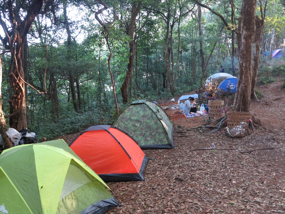 แล้วเราก็เดินลงมาหน่อย มีต้นไม้ใหญ่ มีที่สำหรับให้เรากางเต็นท์ แล้วลูกหาบก็ก่อไฟ ไว้กันหนาว ไว้ให้เราย่างลูกชิ้น 5555