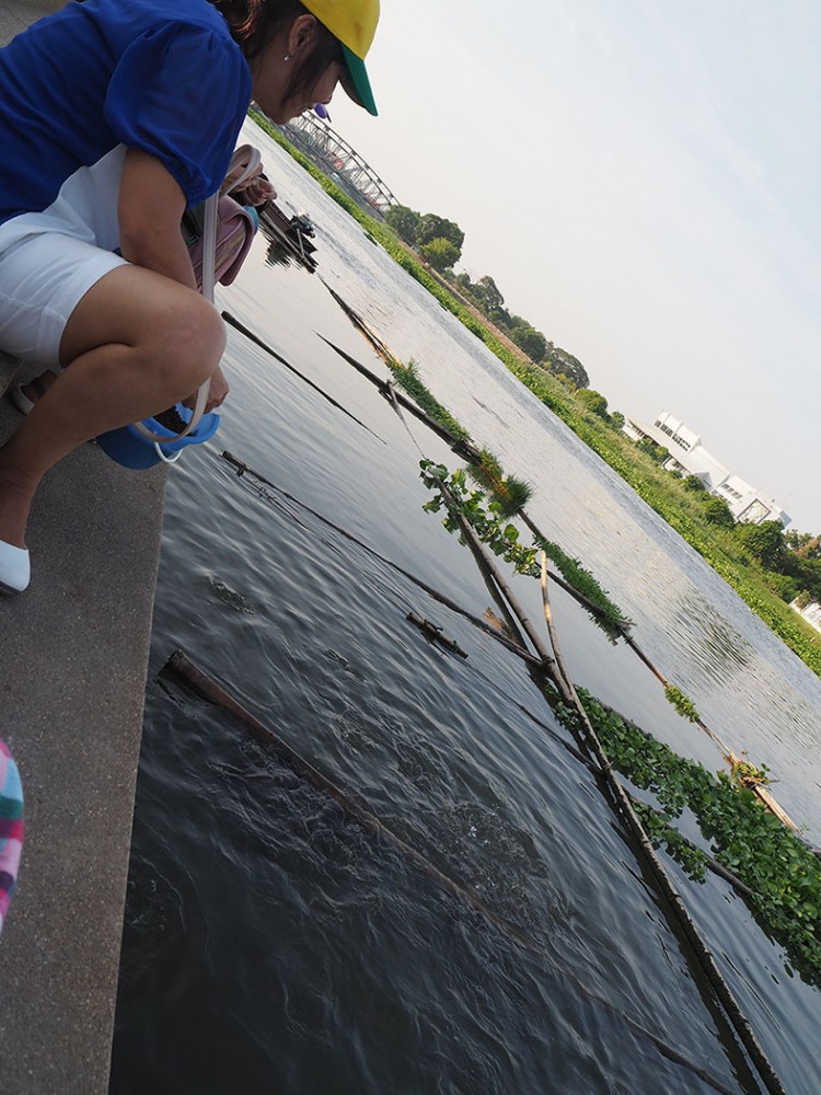 ตรงริมแม่น้กเราสามารถนั่งให้อาหารปลาได้ มีขายถุงละ 20 ยิ่งมานั่งมองใกล้ๆ ยิ่งเห็นความอ้วนของปลาทุกตัว ตัวใหญ่จริงๆ เลย
