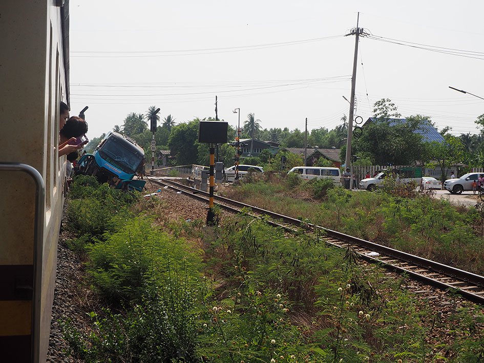 เรานั่งแท็กซี่มาลงสถานีนครชัยศรี แล้วก็ได้ทำการสอบถามชาวบ้านว่าเกิดอะไรขึ้น ข่าวที่ได้ยินคือมีรถไฟชนรถบัสตรงบริเวณงิ้วรายนี้เอง ข่าวร้ายคือ ตายสี่ บาดเจ็บอีกราว 30 กว่าๆ เหตุเกิดเมื่อช่วงเวลาประมาณเจ็ดโมงนี่เอง