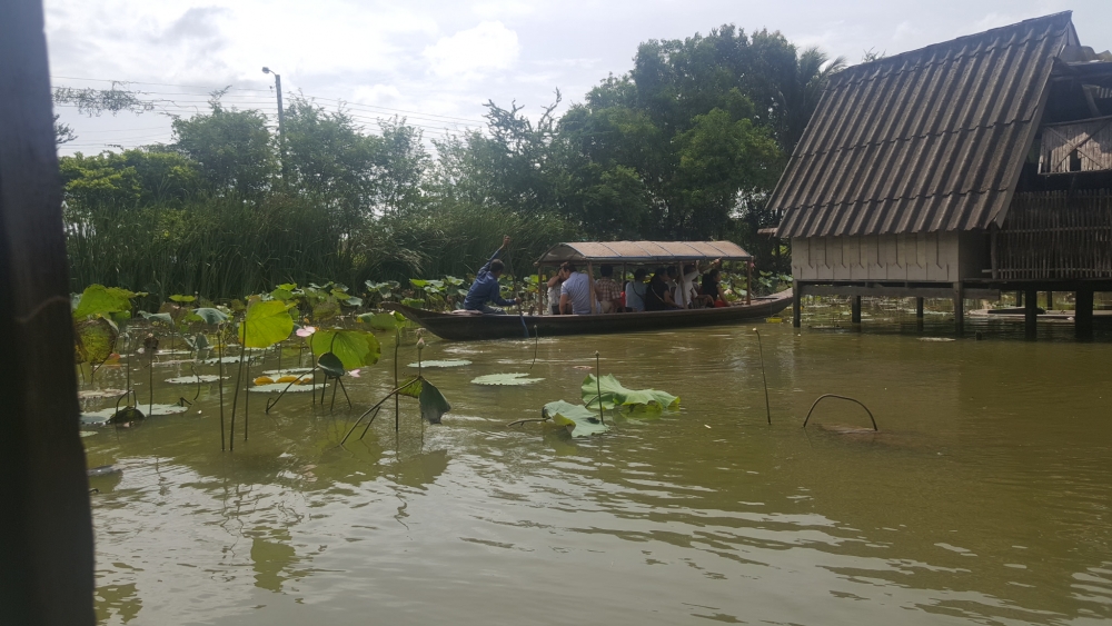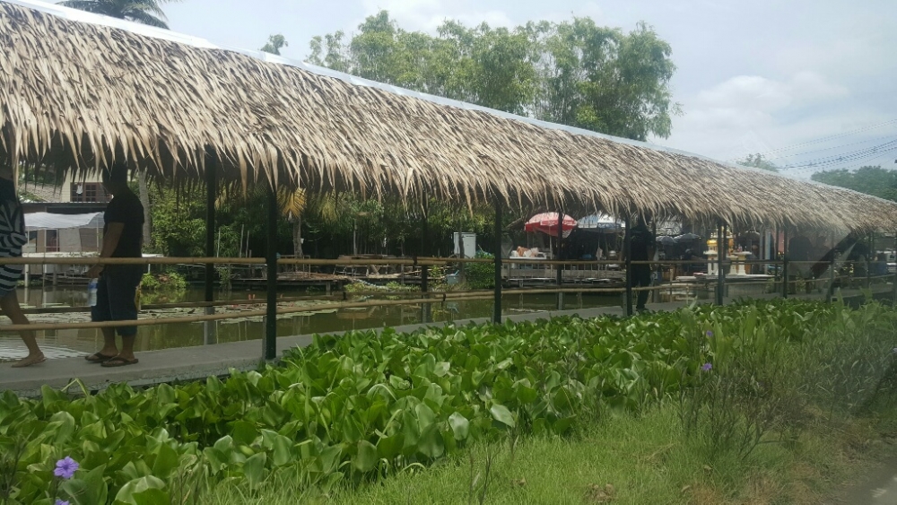 เเค่ทางเข้าก็เห็นบึงบัวเเล้ว สีเขียว สดชื่น เป็นทางเดินเข้าตลาดน้ำ ทำจาก ใบจาก มุงกันเเดด ให้กับคนที่มาเที่ยว