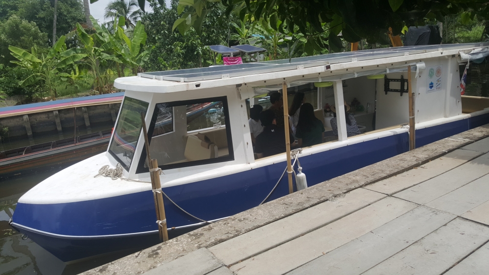 เดินมาสุดทางก็เป็นบ้านกึ่งร้านอาหารคะ ริมคลองเลย เห็นเรือสีฟ้าฟ้า กันไหม เค้าใช้พลังงานโซล่าเซล เเละทดลองให้ขึ้นฟรี ตามรอบ ก็บ่ายสองครึ่ง ตอนเรามาถึงมันเเค่บ่ายโมงครึ่งก็เลยคิดว่า เราไม่รอเเล้วกัน เราจะไปลองขึ้นเรือเเจว ชมคลองดูคะ