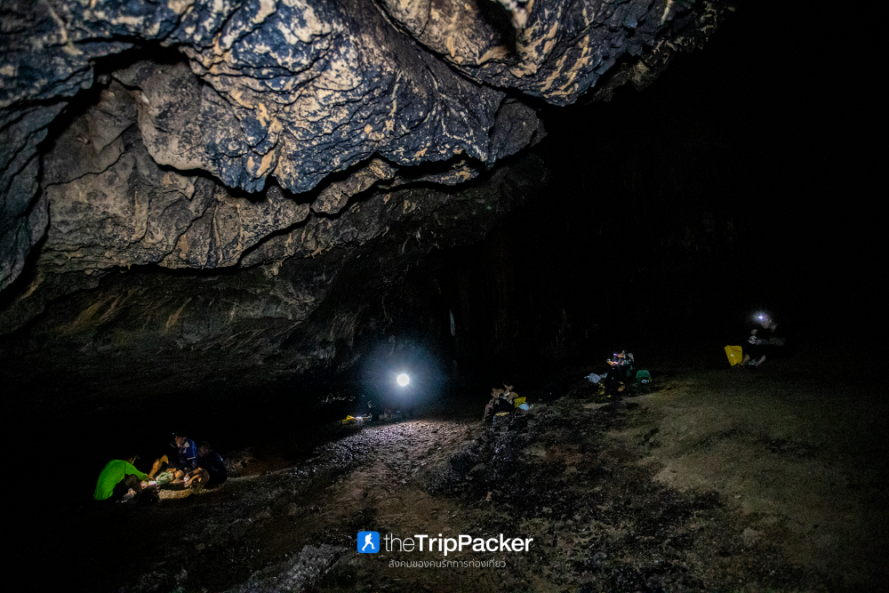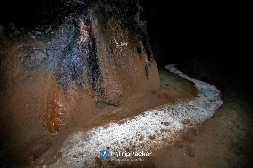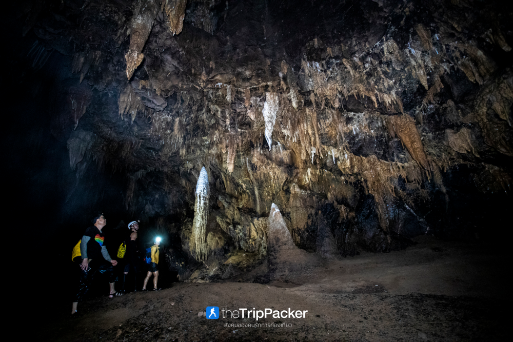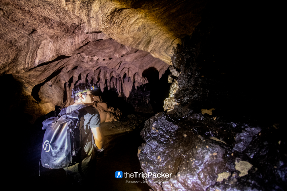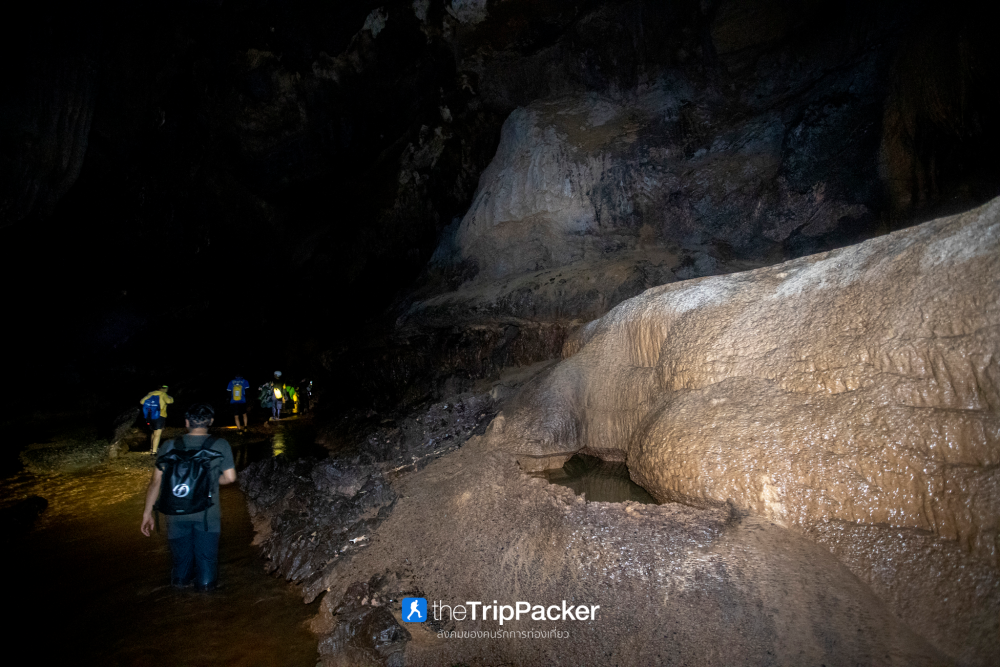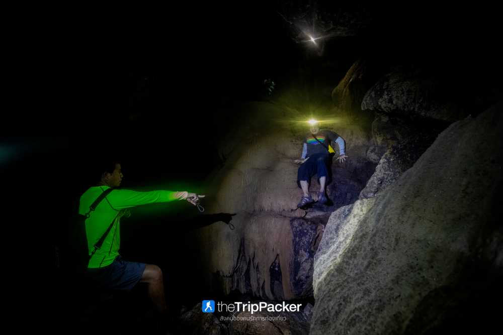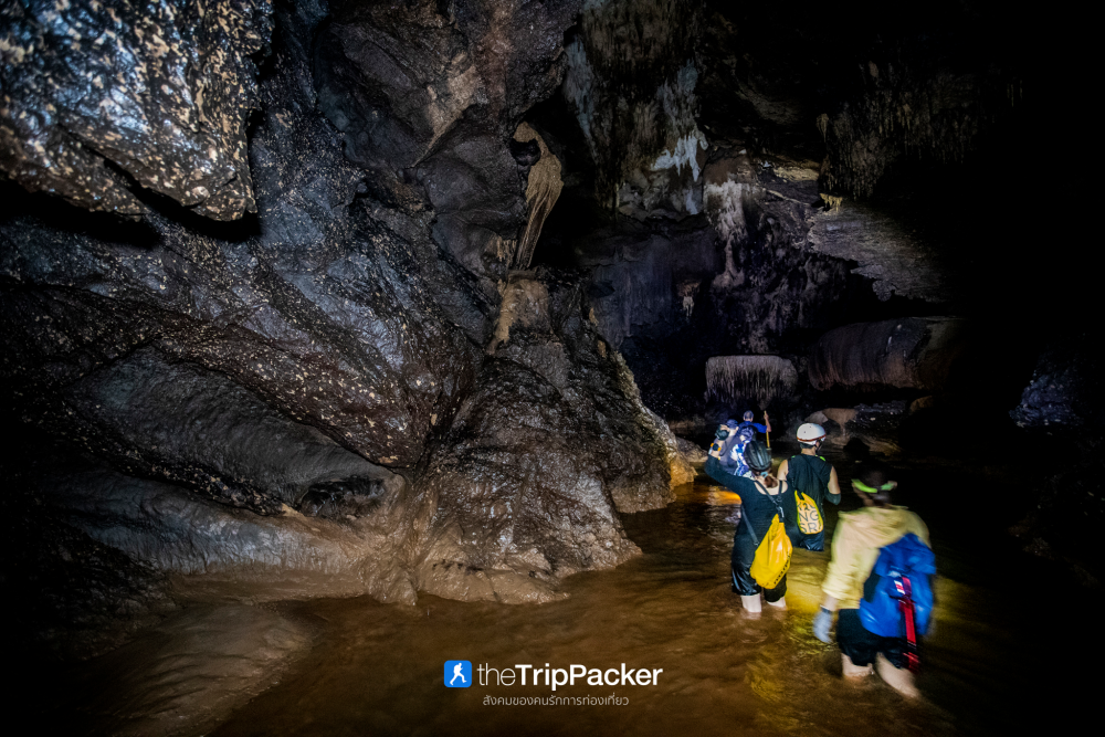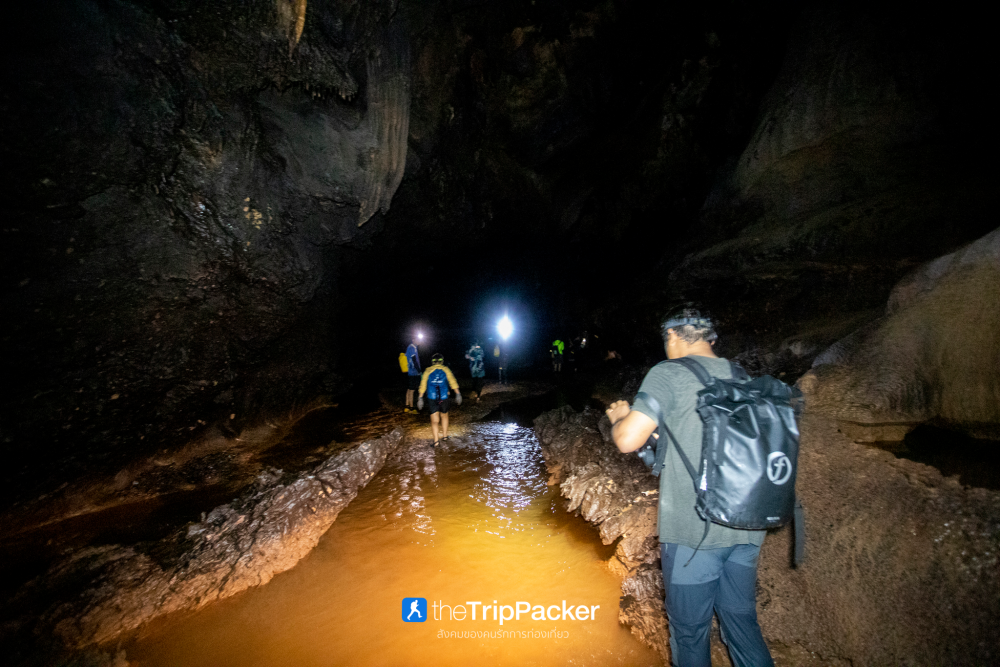 แค่มุดแรกจากช่องแคบ ๆ ของปากถ้ำเท่านั้น แสงสว่างจากภายนอกก็หายไปกลายเป็นความมืดสนิทที่เข้ามาแทนที่ จะมีเพียงแสงสว่างเล็ก ๆ จากไฟคาดหัว ซึ่งระยะการมองเห็นก็ครอบคลุมแค่รอบตัวใครรอบตัวมันเท่านั้น นาทีนี้สิ่งที่สำคัญที่สุดคือ “เดินไปพร้อมกัน ระมัดระวัง หูฟังไกด์ อย่าให้ไฟดับ”