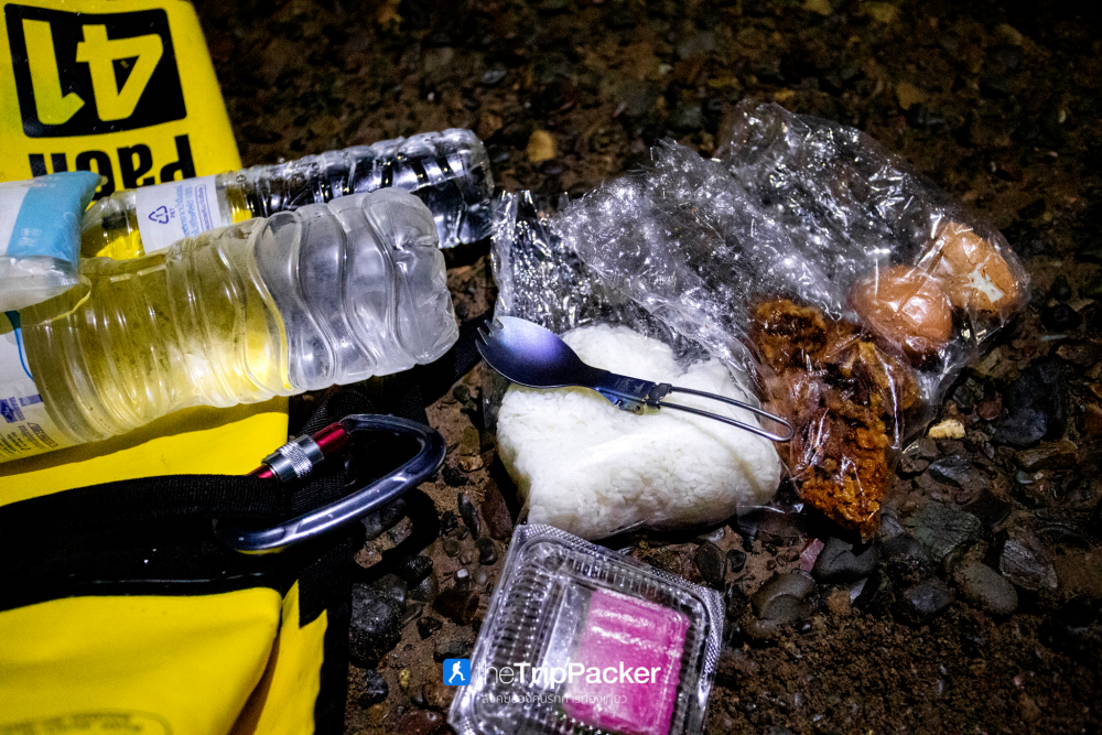 7. เสบียง เท่าที่จำเป็น เช่น น้ำดื่ม (ควรมีอย่างน้อย 1.5 ลิตร) อาหาร ควรเลือกที่แกะทานง่าย ไม่ต้องใช้ภาชนะใส่ และเน้นโปรตีนที่ให้พลังงานสูง รวมถึงขนมหวานทานง่ายให้น้ำตาลได้ด่วน ๆ อย่างลูกอม