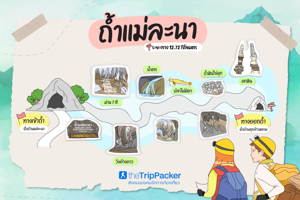 สำหรับเส้นทางการท่องเที่ยวถ้ำแม่ละนา ยังมีเส้นทางระยะสั้นด้วย มีทั้งแบบ ไป-กลับ 2 ชั่วโมง และ ไป-กลับ 4 ชั่วโมง เพื่อเป็นทางเลือกให้กับนักท่องเที่ยวที่ต้องการสัมผัสความสวยงามภายในถ้ำแบบที่ไม่ต้องฮาร์ดคอร์มาก แต่สำหรับเรานั้น ครั้งนี้บอกเลยว่า…ขอจัดเต็ม!! โดยเส้นทางเต็มของตัวถ้ำจะอยู่ที่ 12.72 กิโลเมตร แต่แท้จริงแล้วเราต้องเดินลงเขามาอีกราว 2 กิโลเมตร เพื่อมายังปากถ้ำ ซึ่งรวมระยะทาง และเวลาที่เกิดขึ้นจริงทั้งหมดคือ 14.72 กิโลเมตร ใน 11 ชั่วโมง