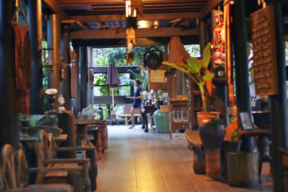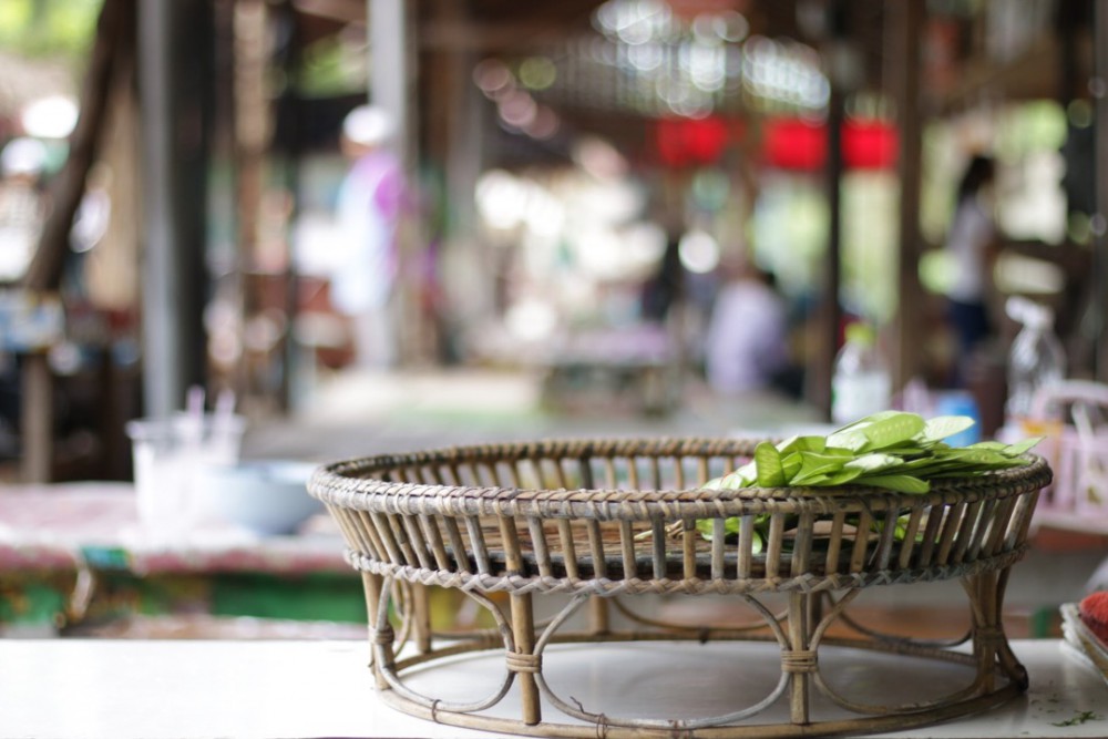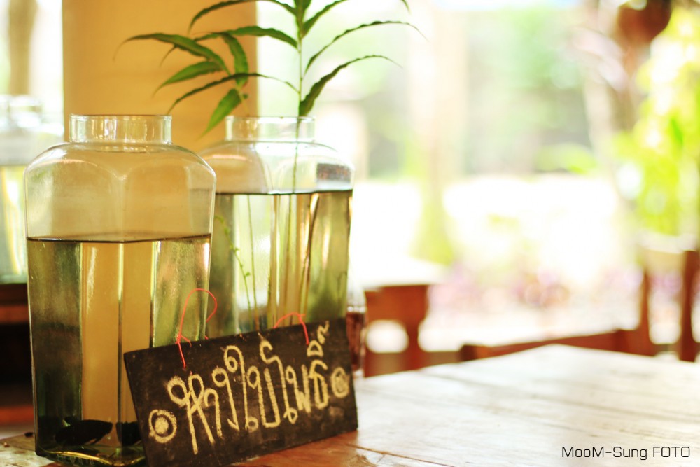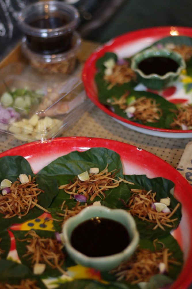 ระหว่างทางที่เดินกลับรถ เราก็แวะชมตลาด (วาย) ไปเรื่อยๆ สนุกจังเลย แต่!!! ในความว่างเปล่าระหว่างนั้น ทำให้เราได้เจอกับมุมสงบในตลาดบางน้ำผึ้ง มุมนี้เป็นบ้านเรือนไทยหลังหนึ่ง บรรยากาศดูย้อนยุค และแสดงถึงความเป็นไทยได้เป็นอย่างดี เมื่อเข้าไปใกล้ๆ ก็พบว่า ร้านนี้เป็นบ้านที่เปิดขายเมี่ยงคำ และน้ำดื่ม รออะไรล่ะ ต้องเข้าไปสำรวจสิ่