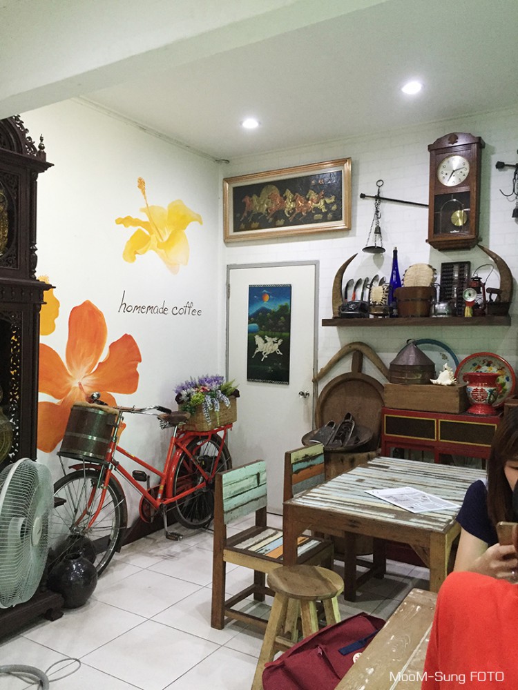 จุดแรกที่เราเลือกที่จะแวะพัก คือร้านกาแฟในบ้าน ภายในตัวร้านตกแต่งด้วยของเก่าๆ มากมายหลาก ดูแล้วก็ทำให้นึกถึงความทรงจำเก่าๆ มากมายเลย