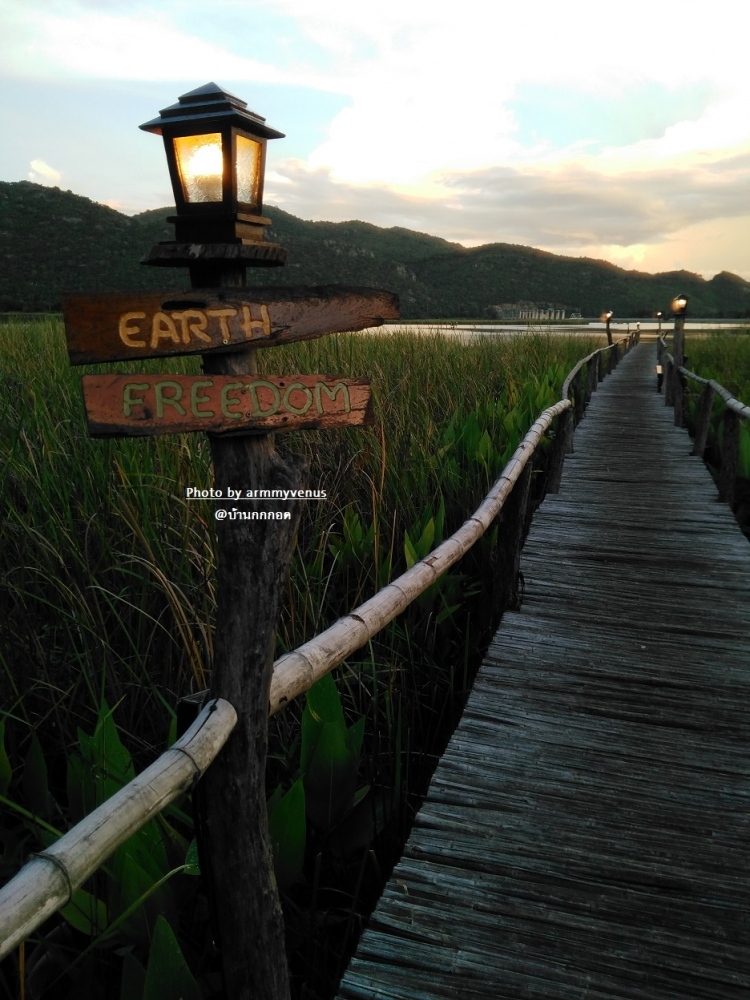 ด้านหน้ารีสอร์ทเป็นสวนที่ถูกจัดไว้เป็นสัดส่วน โดยมีเจ้าห่านแสบ 5 ตัว ยืนจังก้าร้องเปิ๊บป๊าบประหนึ่งไล่แขก แต่ก็อีกแหละ ด้วยความน่ารักของมันเราก็ต้องยอมฟังเสียงเปิ๊บป๊าบทั้งคืน ถึงเวลาเช้ามามันก็เดินมาต้อนรับขับสู้เต็มที่ มาถึงจุดนี้เราเห็นควรว่าไปรอพระอาทิตย์เรืองรองที่ริมเขื่อนดีกว่า วิวริมเขื่อนจริงๆ แล้วมี 2 มุม เราเลือกมุมที่เป็นทิวเขาสับหว่างกัน มันมีหมอกจางๆ ระหว่างภูเขาแต่ละลูก มีดาวพระศุกร์ที่ยอดเขาลูกหนึ่ง เงาสะท้อนจากคุ้งน้ำและไอเย็นๆ ทำให้อากาศเย็นสบายยามเช้า เรานั่งเล่นและถ่ายรูปไปเรื่อยๆ จนกระทั่งแสงทองของวันใหม่สาดส่องมา เราจึงเปลี่ยนไปกินอาหารเช้าแทน