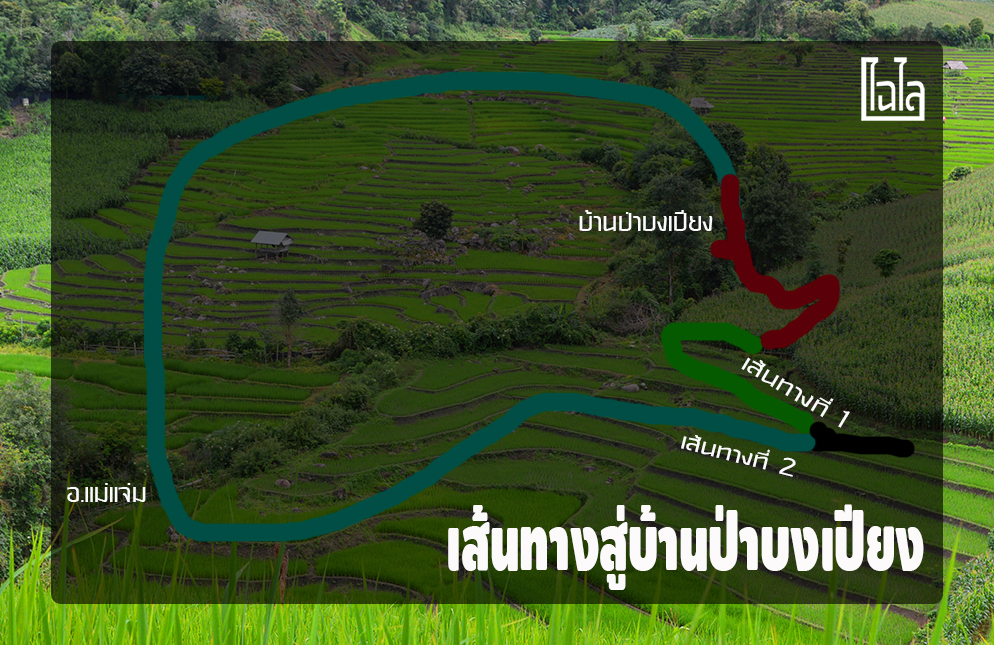 เส้นทางที่ 2 (เส้นสีฟ้า) จะเข้าป่าบงเปียงโดยวนผ่านตัวอำเภอแม่แจ่มก่อน ซึ่งจะเห็นว่าเป็นเส้นทางที่อ้อมพอสมควร เส้นทางจะเป็นถนนอย่างดี แต่มีความชันและคดโค้ง จนถึงช่วงสุดท้ายที่ทางค่อนข้างเละ(เส้นสีแดง) แต่ก็เป็นทางลำบากแค่ช่วงสั้นๆ และสั้นกว่าเส้นทางแรก