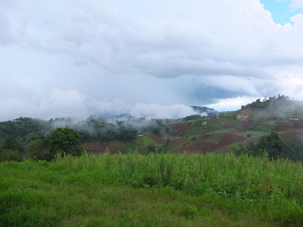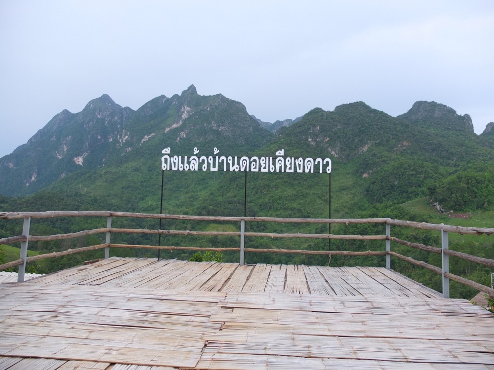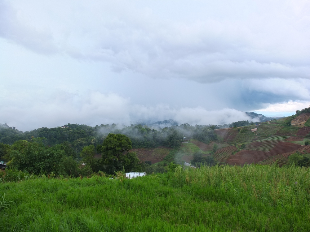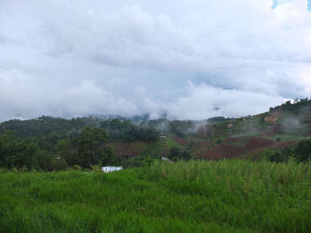 นั่งรถวนๆ ไต่เขา ขึ้นเนิน ไปประมาณชั่วโมงกว่าๆ ผ่านสายฝน (แน่ล่ะมาหน้าฝน มันก็ต้องเจอฝนสิ) เราก็ถึงโลตัสเชียงดาวตามที่อ่านรีวิวมา(ยังๆ ยังไม่ถึงบ้านระเบียงดาว ต้องต่อรถสองแถวขึ้นไปอีก) มาถึงก็บ่ายล่ะไง คิวรถสองแถวหมด ต้องเหมาอย่างเดียว ดีนะได้เพื่อนร่วมทางอีก 2 คน มาช่วยหารค่ารถ นั่งรถขึ้นมาอีกชั่วโมงกว่าคร้าา ทางไม่ลำบากนะ แต่ถ้าไม่ชำนาญก็น่ากลัวอยู่ ชันบ้าง โค้งหักศอกบ้าง อ่อ มันจะผ่านด้านของป่าไม้ด้วย จ่ายค่าผ่านด่านด้วยนะ